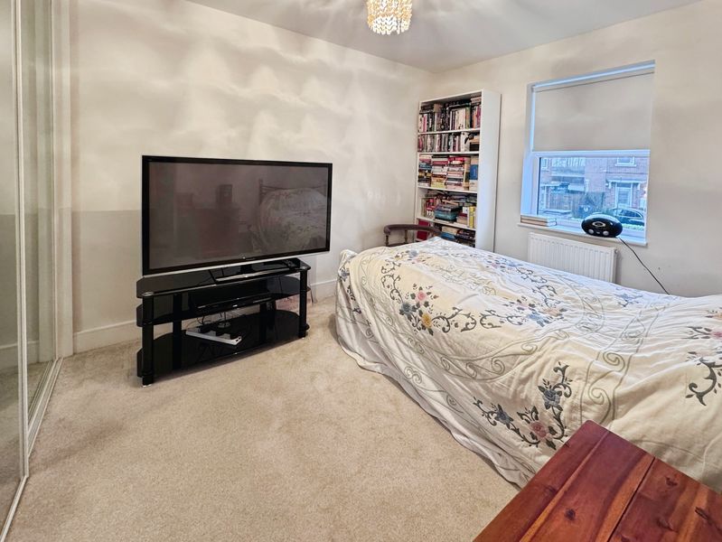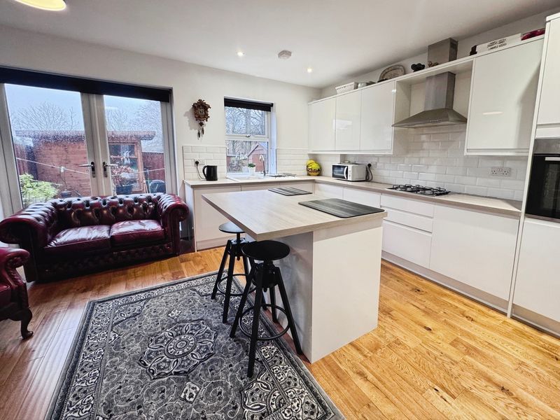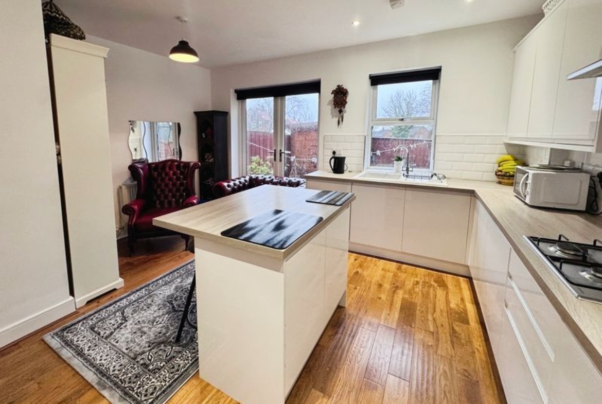Inside, the main reception room features large windows, creating a bright central living area. The kitchen includes a useful island, dining space and direct access to the garden, making it convenient for everyday family life. A downstairs WC adds extra practicality. On teh second floor, the master bedroom benefits from an en-suite and built-in wardrobes, while a second double bedroom also offers built-in storage. Two further single bedrooms provide flexible space for children, guests or a home office. The main bathroom includes a shower over bath and a heated towel rail.