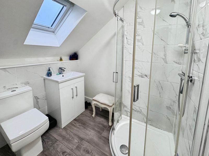Skylight, shower, vanity wash hand basin, low level wc, part tiled and heated towel rail.