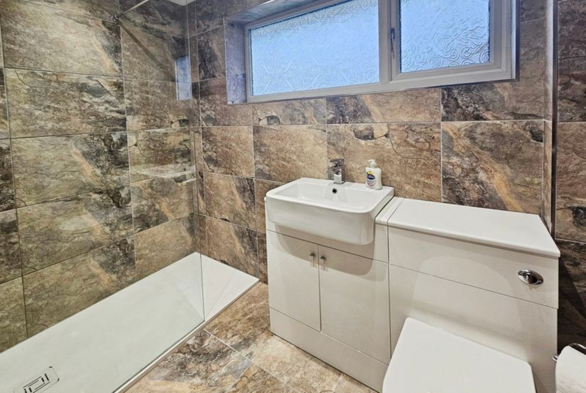 Three piece white suite comprising of; wash hand basin (set in vanity unit), double walk in shower cubicle, low level wc, spotlights, double glazed window to rear, heated towel rail, tiled walls and flooring, extractor fan.