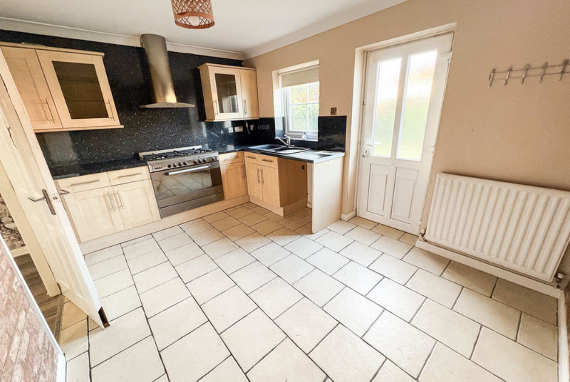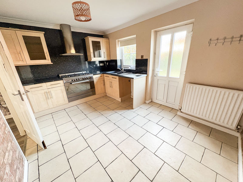 KITCHEN: (rear): 13’22 x 9’25, (4.02m x 2.81m), double glazed window to rear, range of wall, floor and drawer units with coordinating roll edge work surfaces, coordinating sink unit and drainer with mixer tap, space for cooker, space for fridge freezer and patio doors to rear garden.