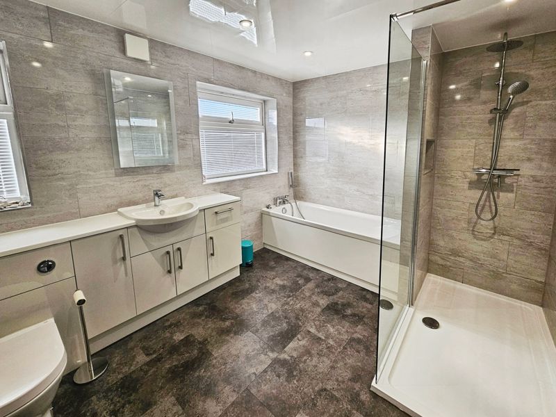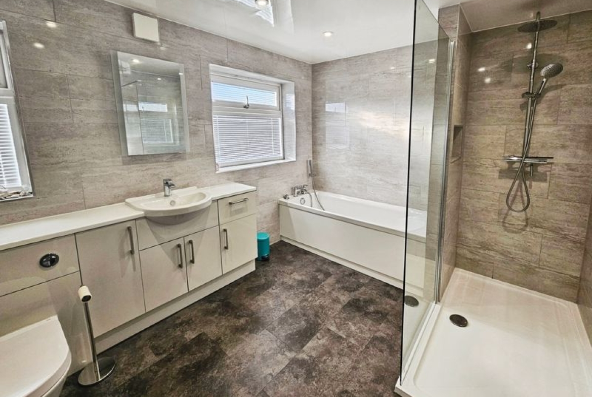 Two double glazed windows to rear, panelled bath, wash hand basin and low level wc set in vanity unit, walk in shower cubicle, spotlights, heated towel rail, part tiling to walls, laminate flooring, extractor fan.