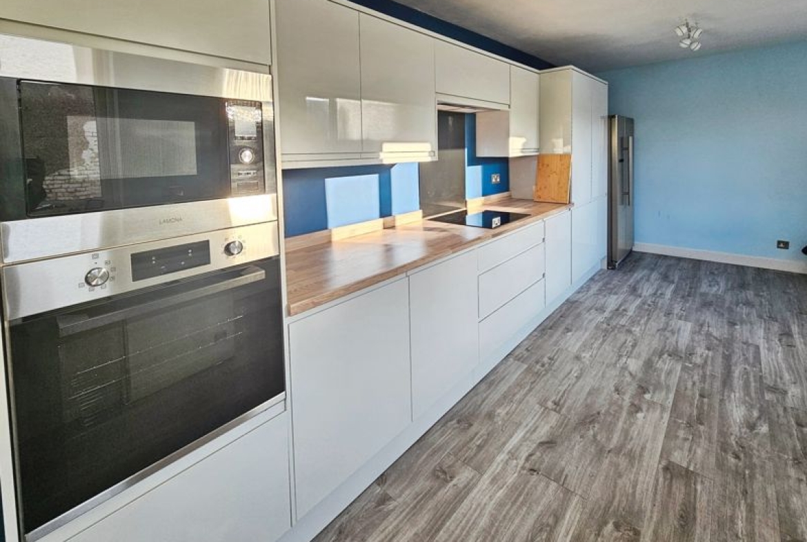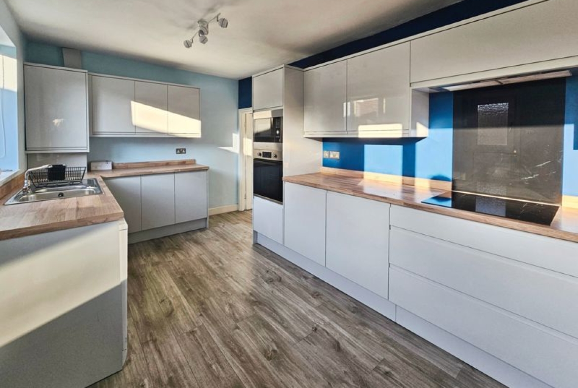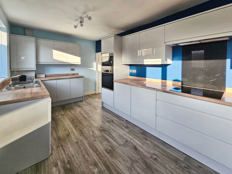 Two double glazed windows to the rear, double radiator, fitted with a range of wall, floor and drawer units with co-ordinating roll edge work surfaces, stainless steel sink unit and drainer with mixer tap, built in electric fan assisted oven, electric/induction hob with extractor fan above, space for fridge, plumbed for washing machine, laminate flooring, double glazed window to the rear.