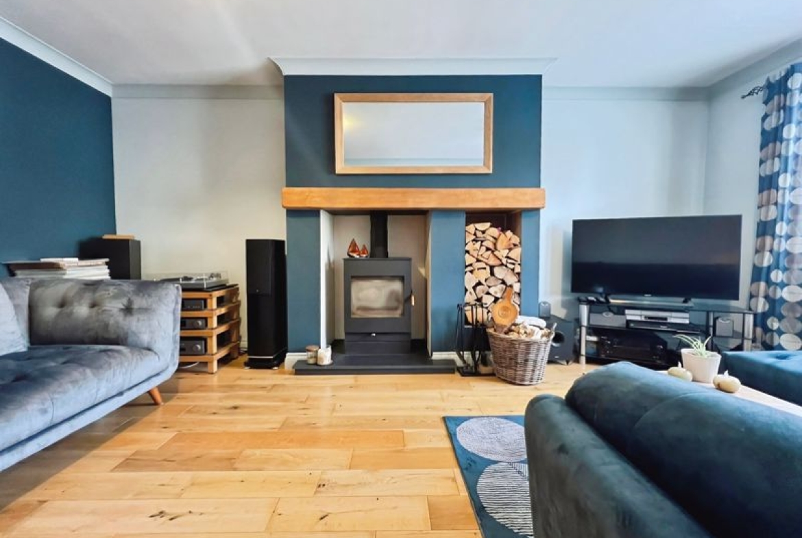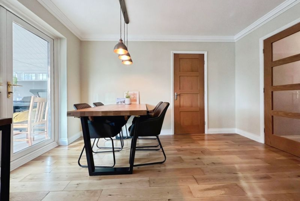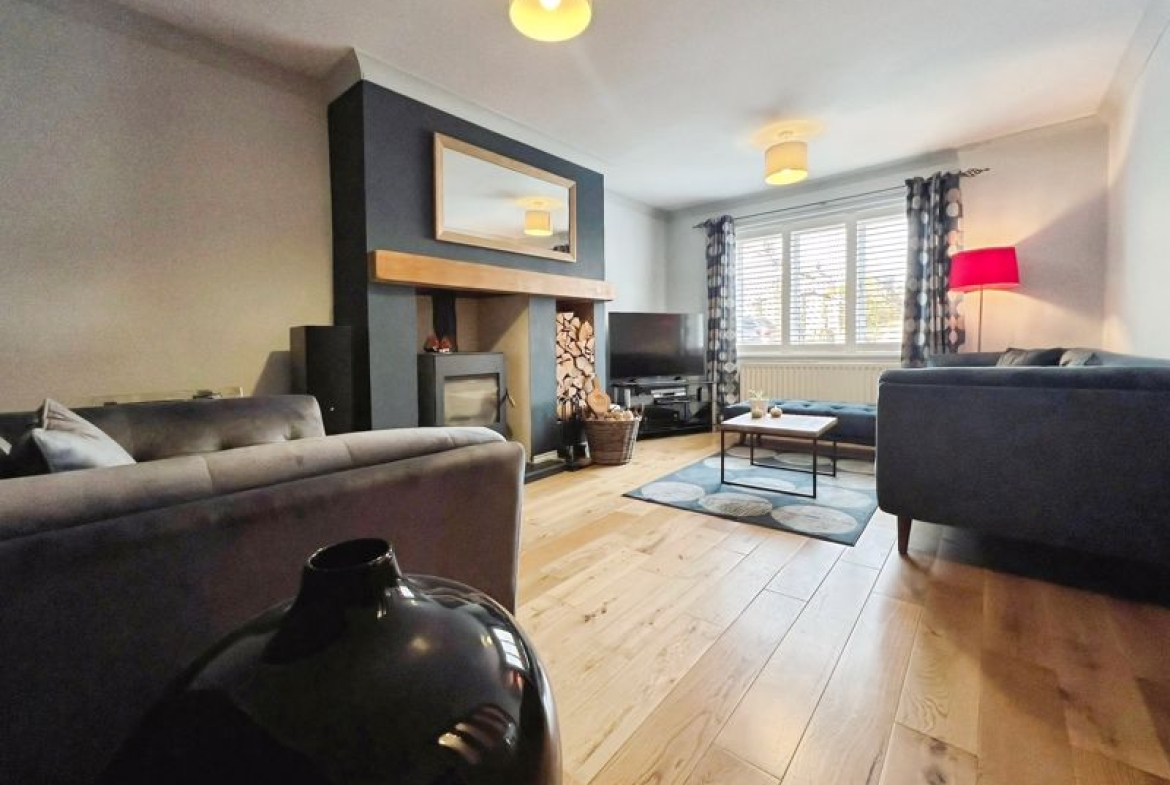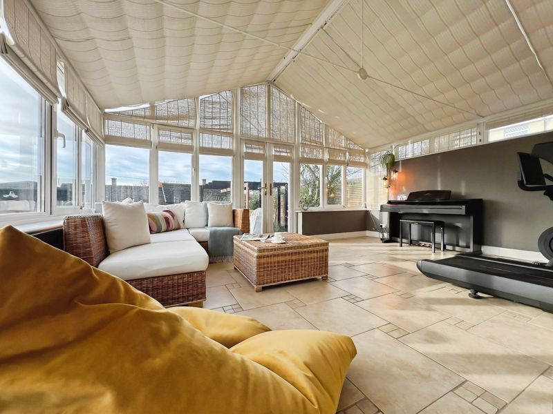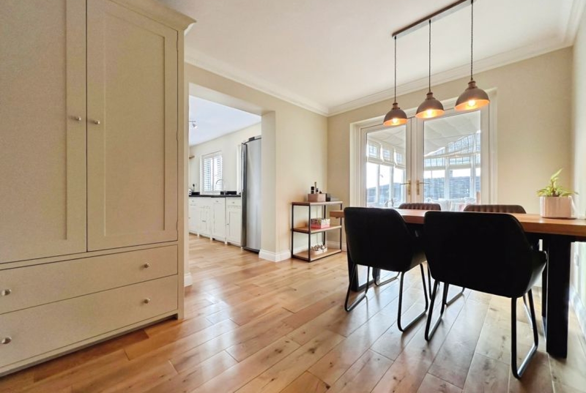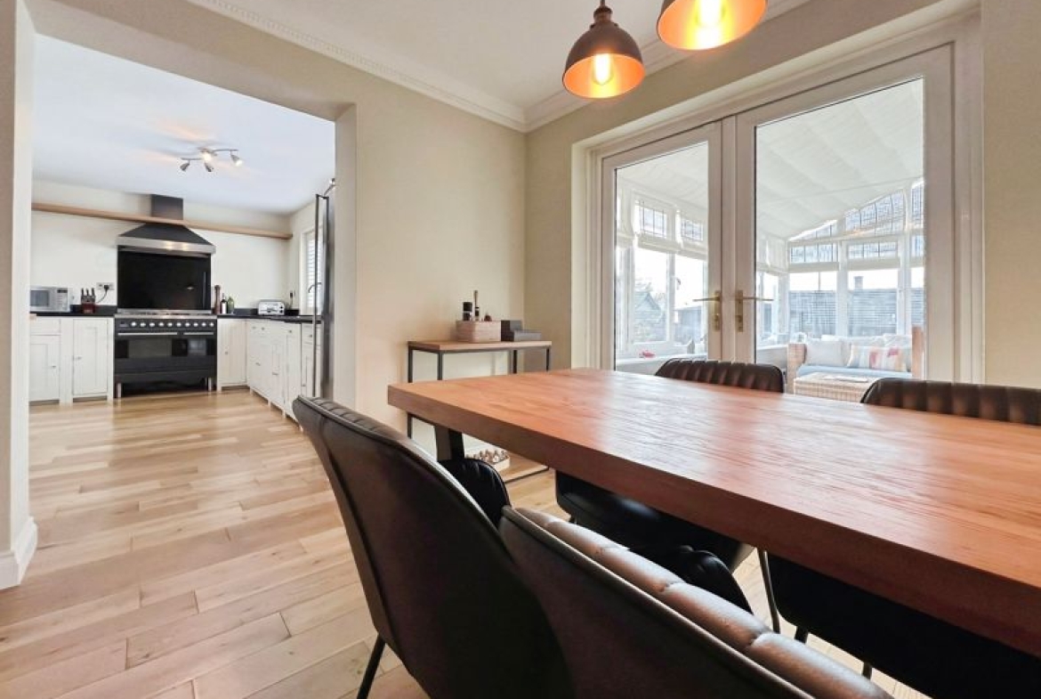 Three welcoming reception rooms offer flexible spaces for relaxation and entertaining. The main living room benefits from large windows and a log burner, creating a cosy environment. The dining room includes French doors that open into the sun room, while the conservatory, complete with heated flooring, offers direct access to the garden.
