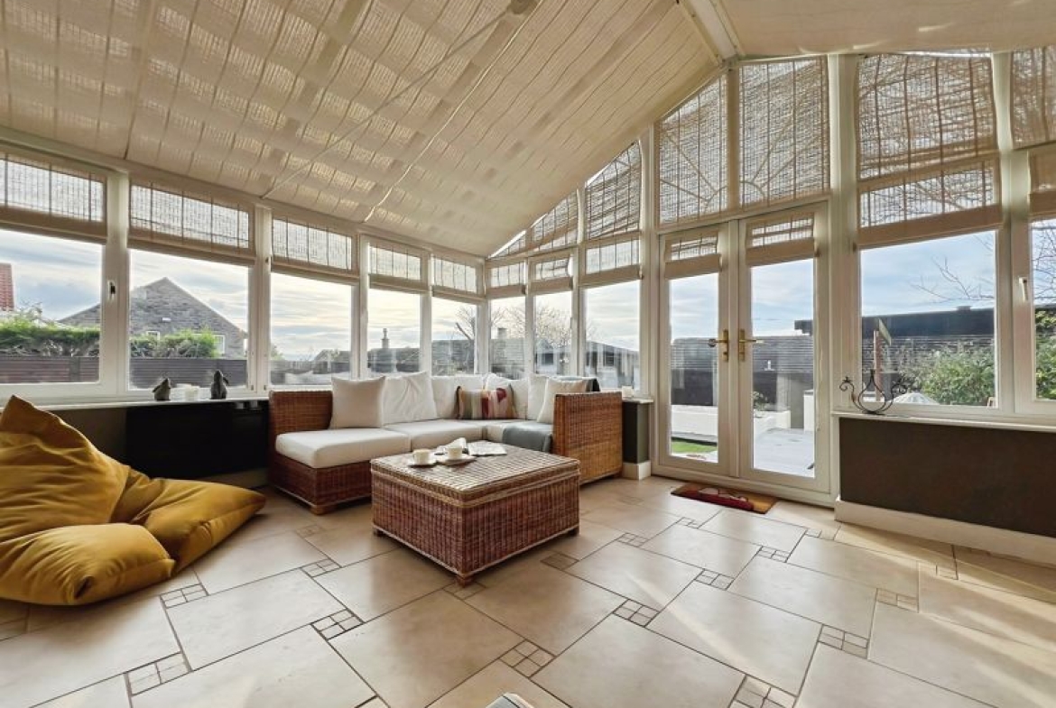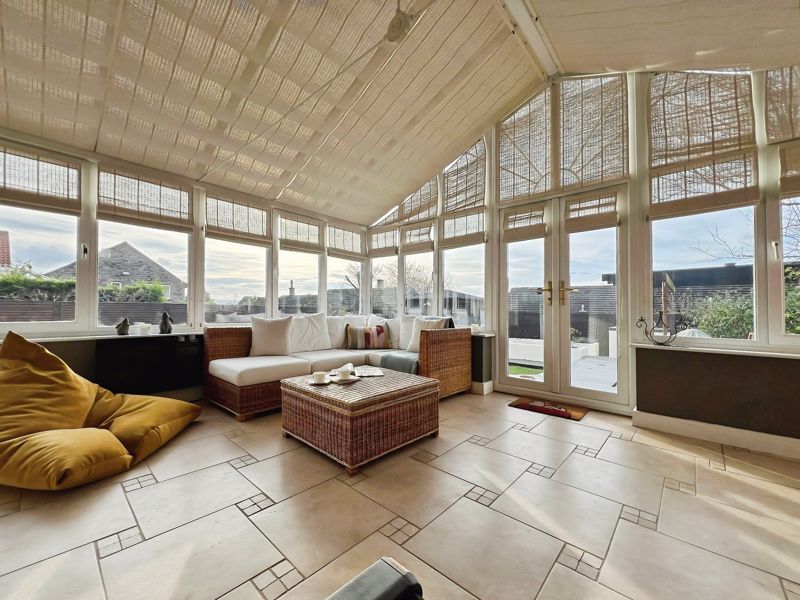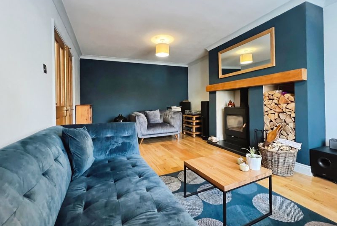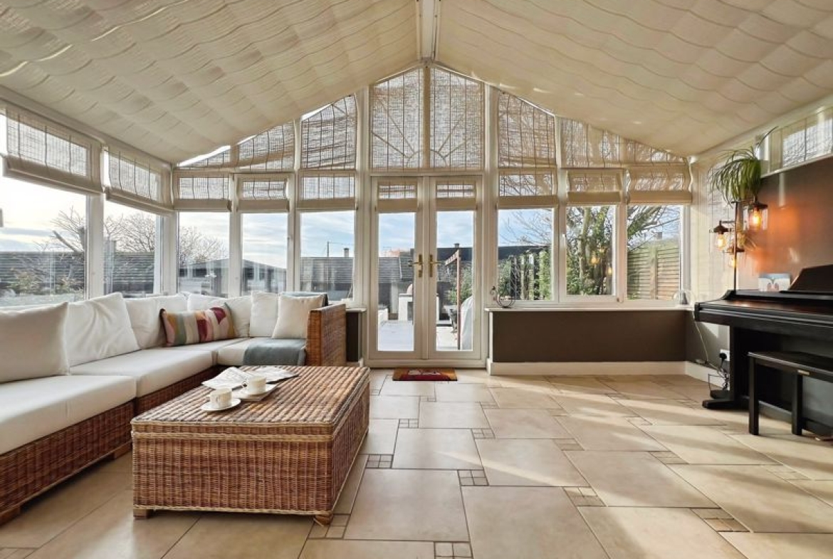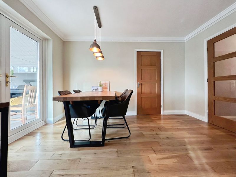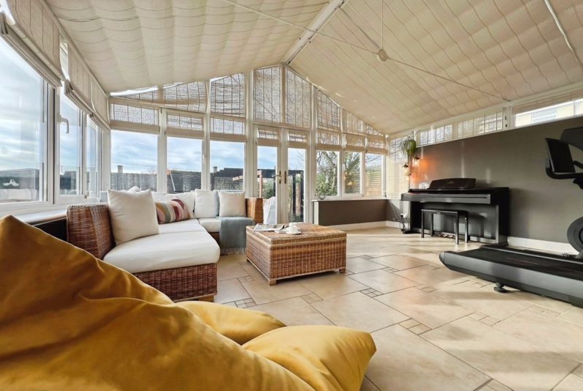 Three welcoming reception rooms offer flexible spaces for relaxation and entertaining. The main living room benefits from large windows and a log burner, creating a cosy environment. The dining room includes French doors that open into the sun room, while the conservatory, complete with heated flooring, offers direct access to the garden.
