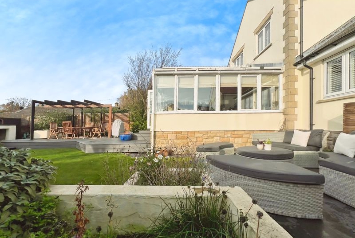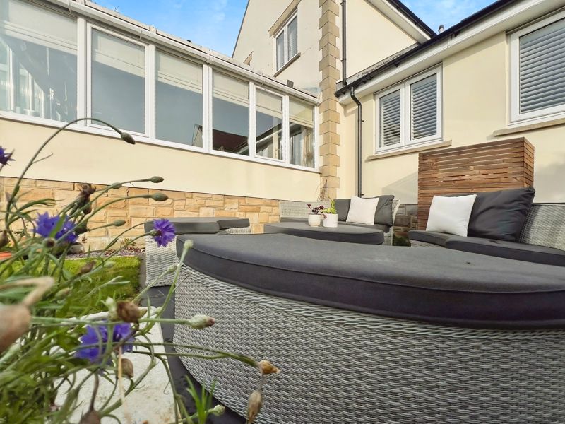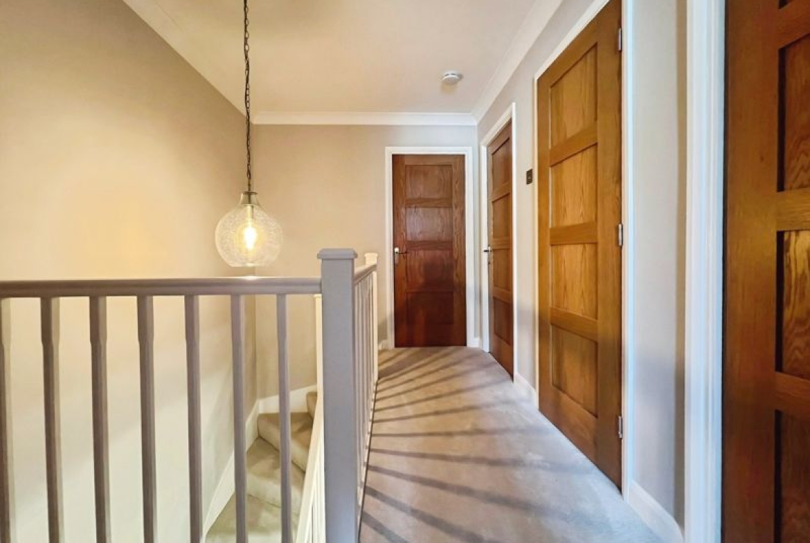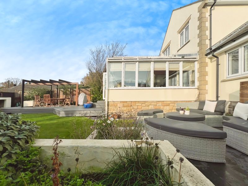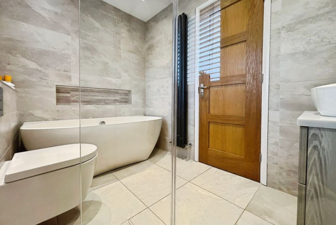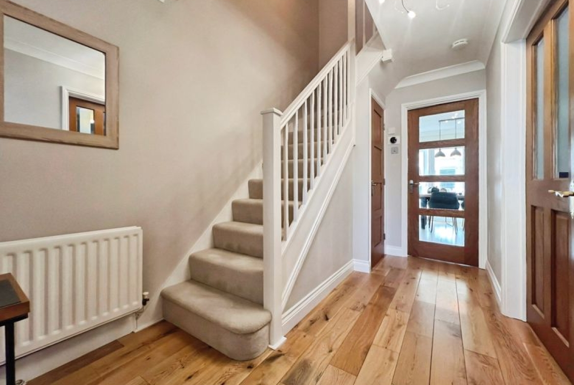 Three welcoming reception rooms offer flexible spaces for relaxation and entertaining. The main living room benefits from large windows and a log burner, creating a cosy environment. The dining room includes French doors that open into the sun room, while the conservatory, complete with heated flooring, offers direct access to the garden.