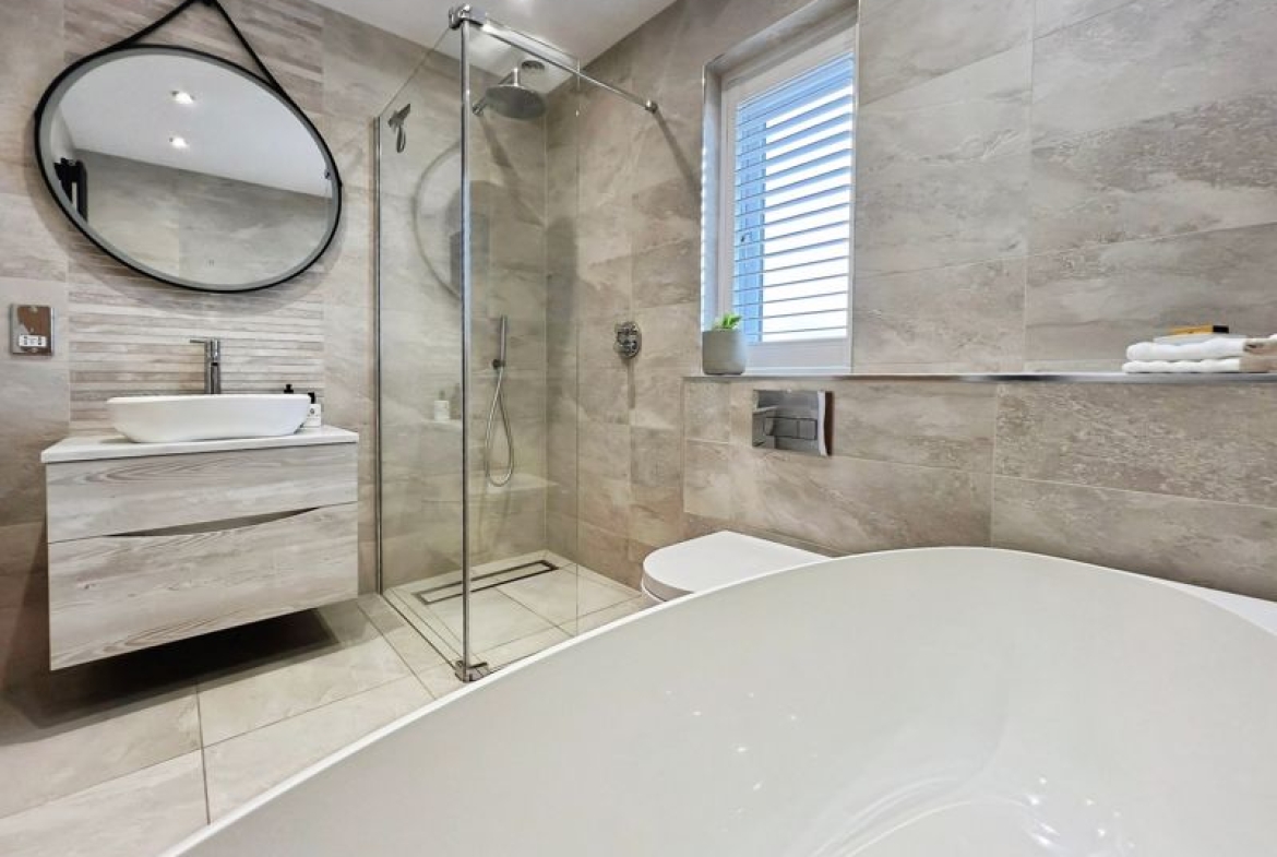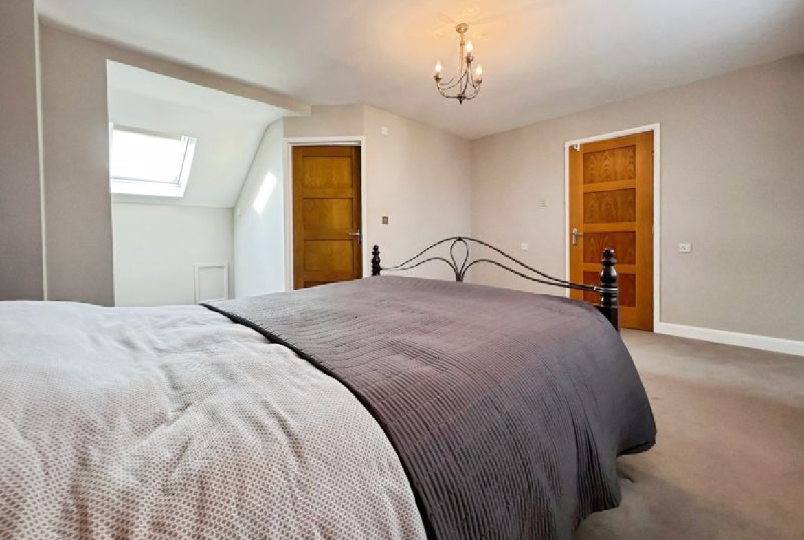 Four generous double bedrooms provide comfortable accommodation. The master bedroom enjoys an en-suite with rain shower, heated towel rail, and a well-appointed dressing area. Additional bedrooms include built-in wardrobes and open views. The family bathroom is equipped with a free-standing tub, shower unit, and heated towel rail.