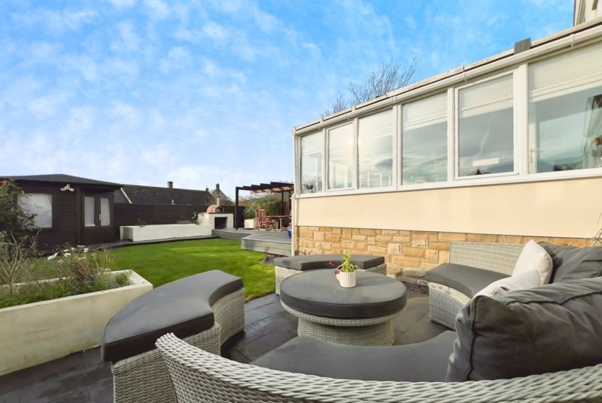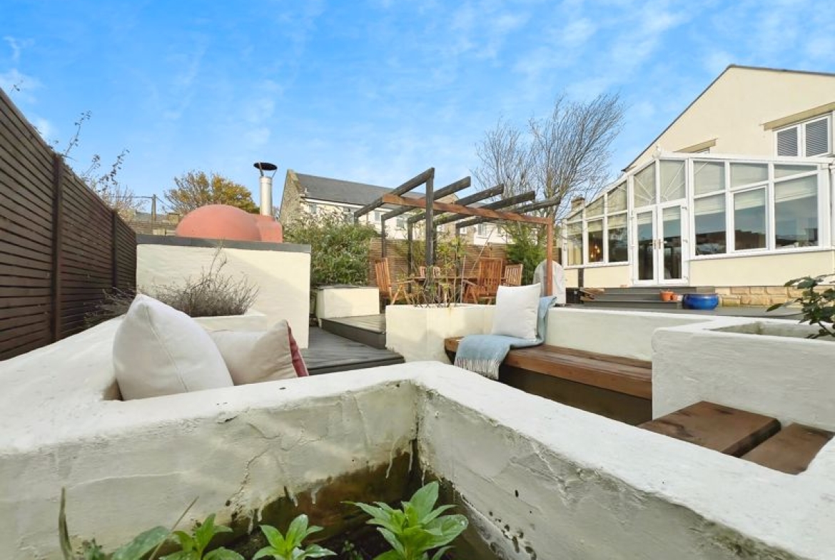 Plantation shutters are installed throughout the house, lending a sophisticated touch. Outdoors, a west-facing garden presents an ideal setting for al fresco entertaining, boasting a garden office, pizza oven, sunken seating area, and lawn area..