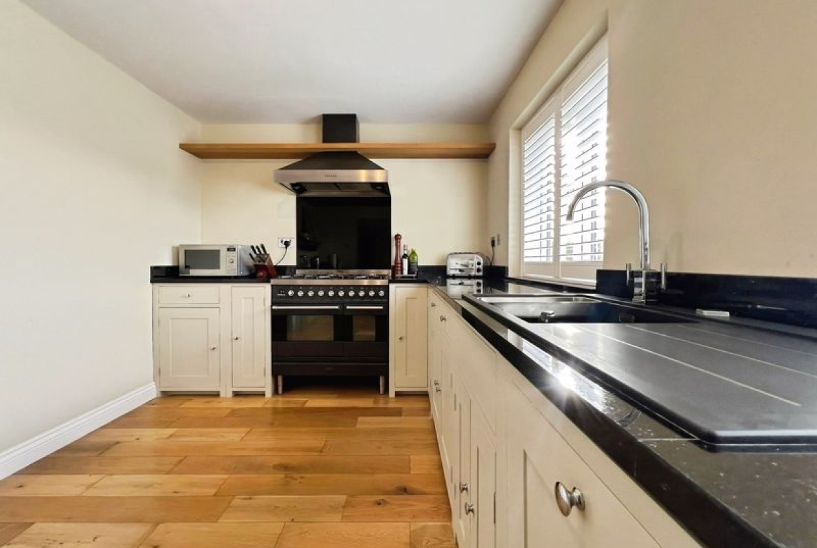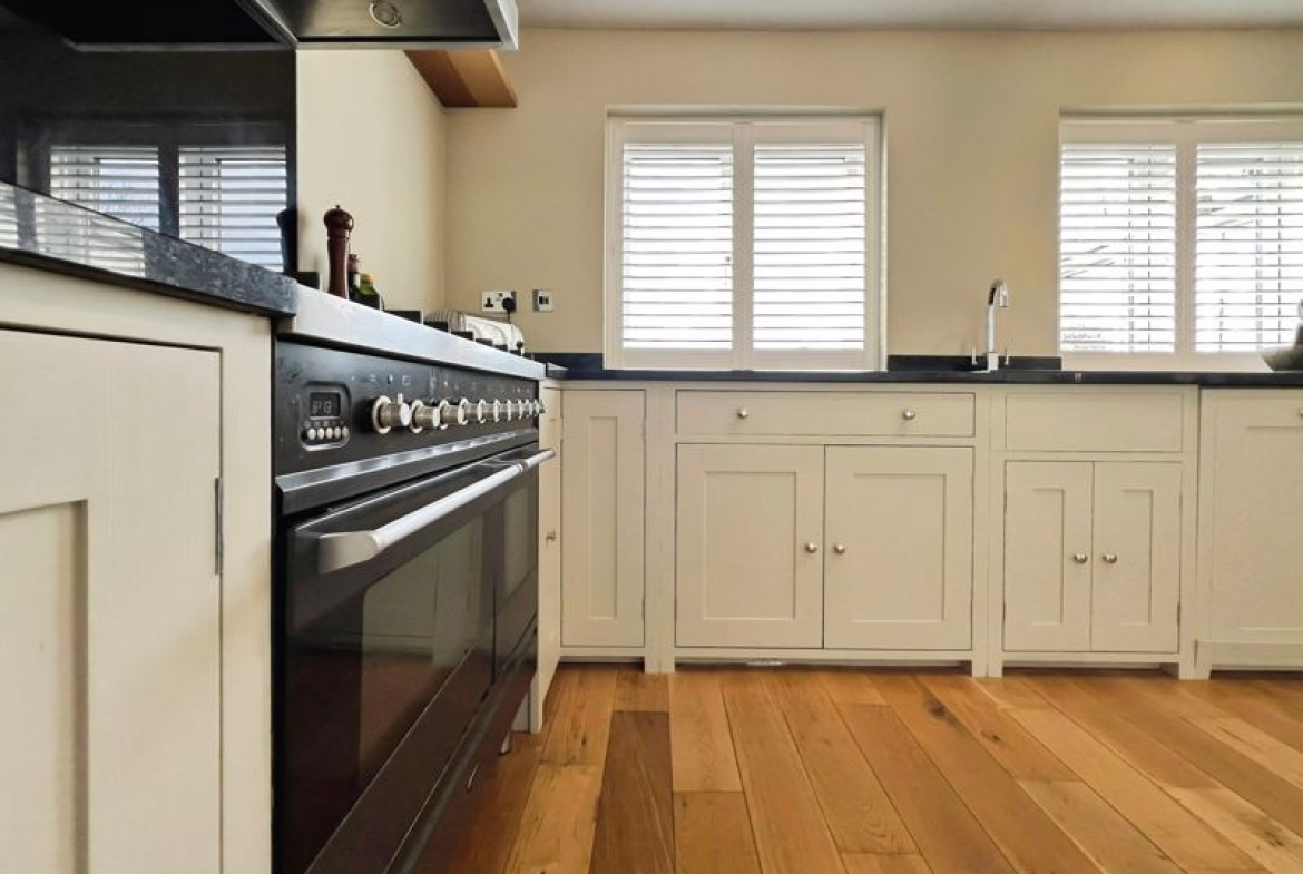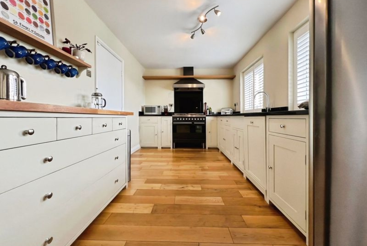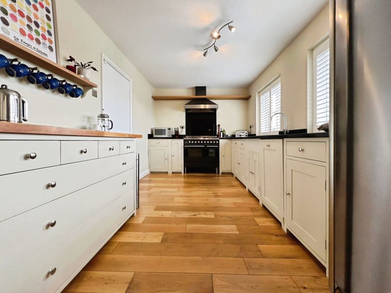 The thoughtfully designed kitchen features in-frame shaker units, heated flooring, ample natural light and a dedicated dining space.