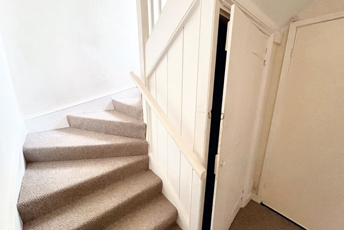 Radiator | Under-stairs cupboard | Staircase to first floor | Doors to lounge and entrance hall