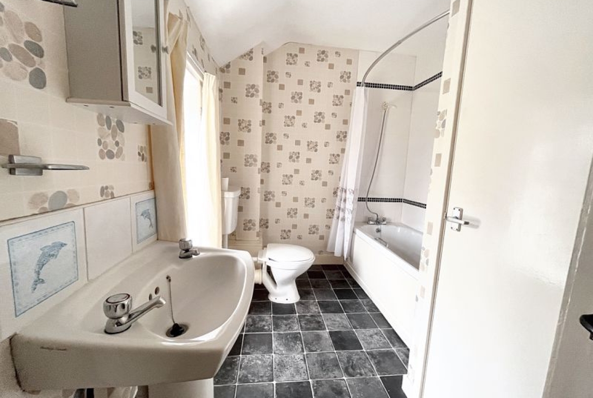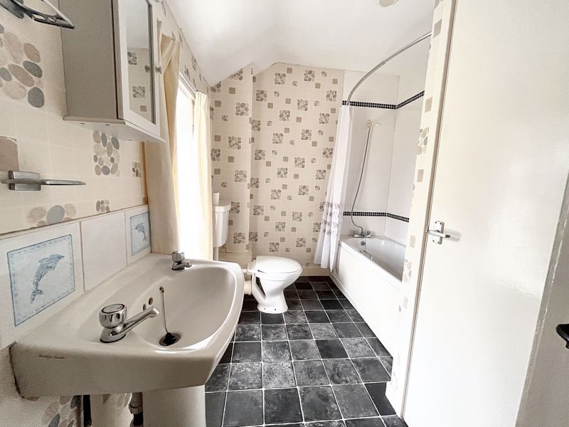 Bath with shower attachment to tap and a tiled surround | Low-level W.C | Pedestal wash-hand basin | UPVC double-glazed frosted window | Radiator | Storage cupboard housing gas central heating boiler