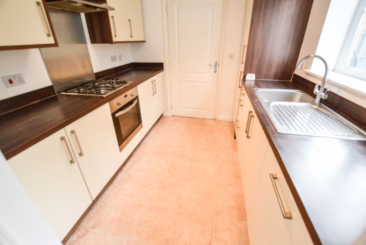 Double glazed window to rear, range of wall, floor and drawer units with roll top works surfaces, stainless steel sin and drainer unit with mixer tap, built in electric fan assisted oven, gas hob with extractor fan above, integrated fridge/ freezer and dishwasher, tiled flooring.