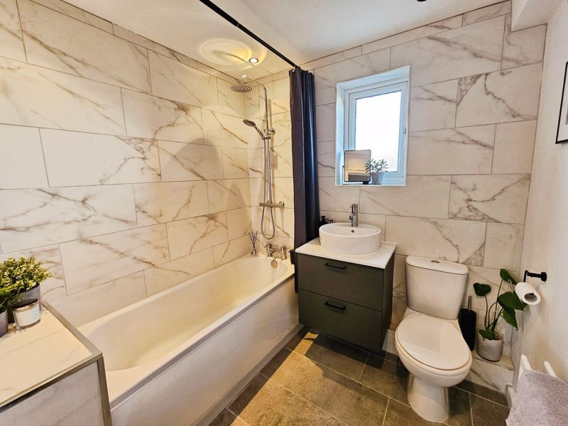 Four piece white suite comprising of; panelled bath with mains shower over, wash hand basin (set in vanity unit), low level wc, spotlights, double glazed window to rear, double radiator, part tiling to walls, extractor fan.