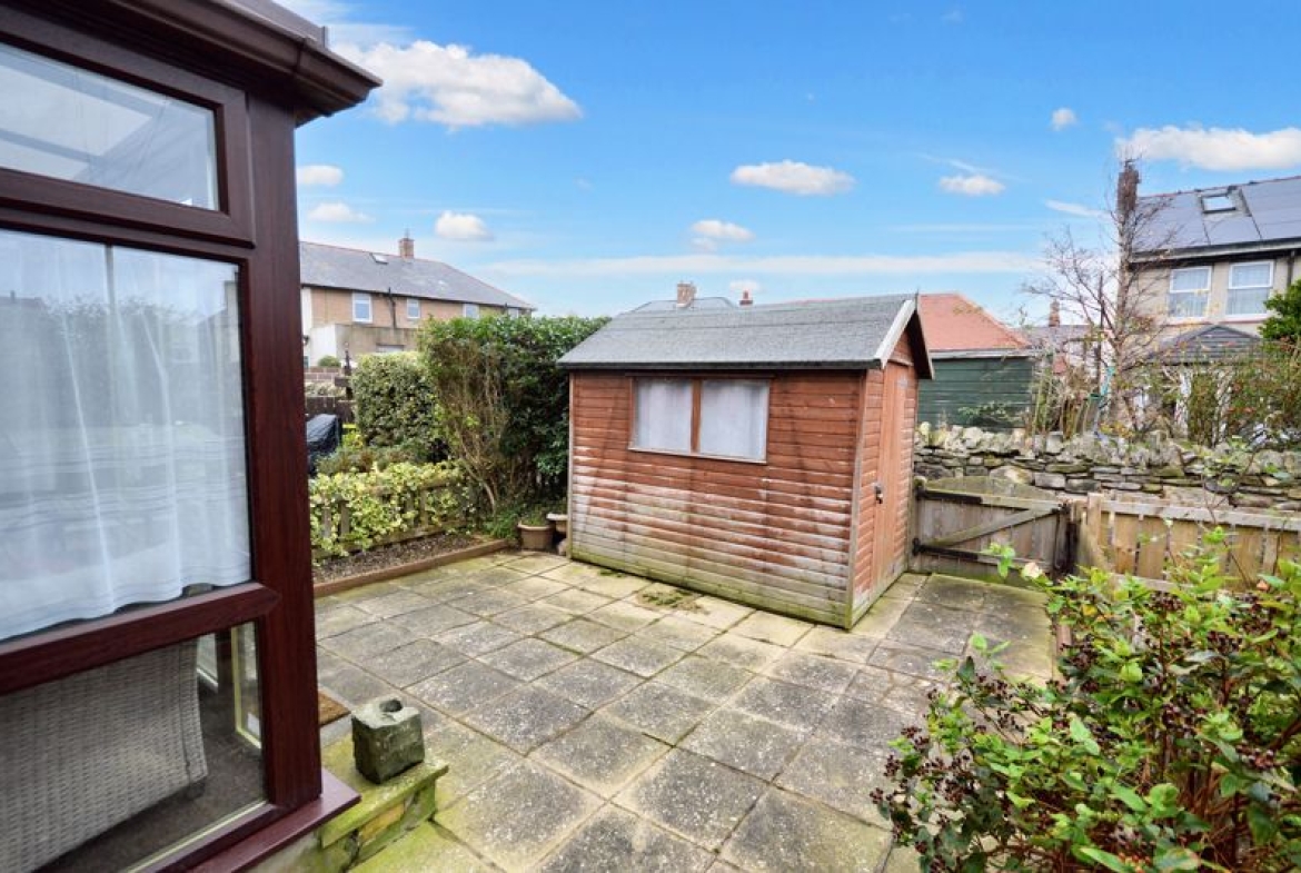 Paving to front garden including a garden shed and picket fenced boundaries |