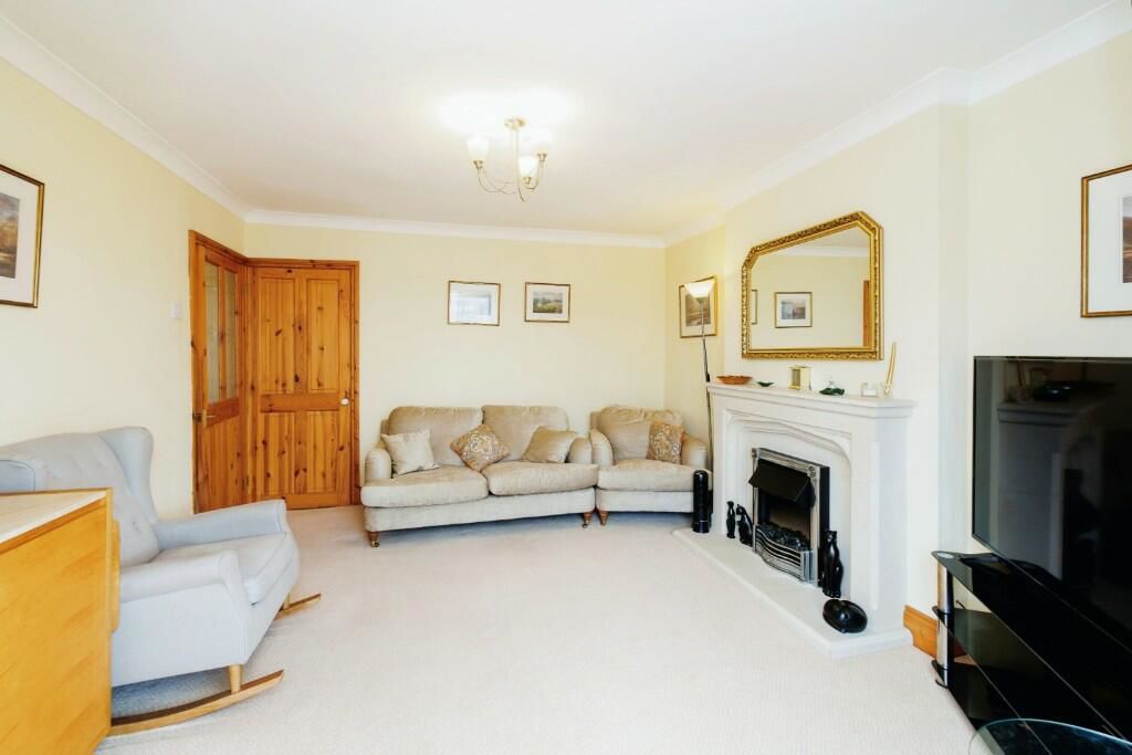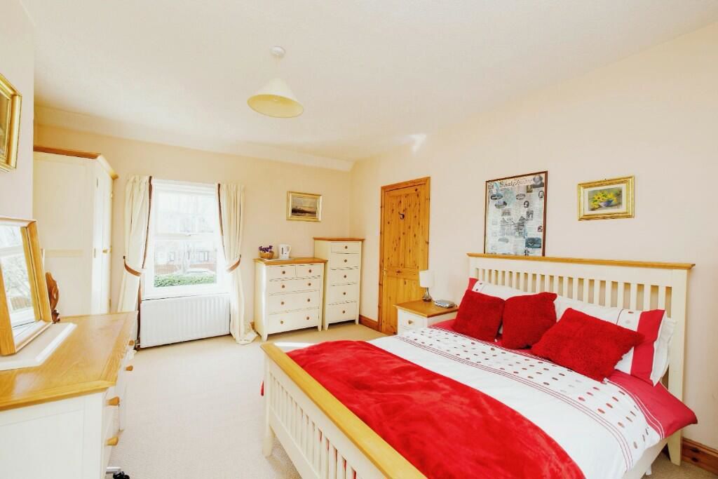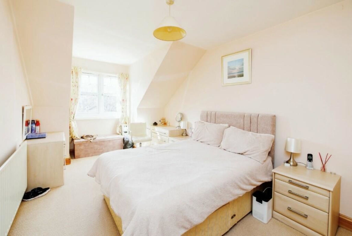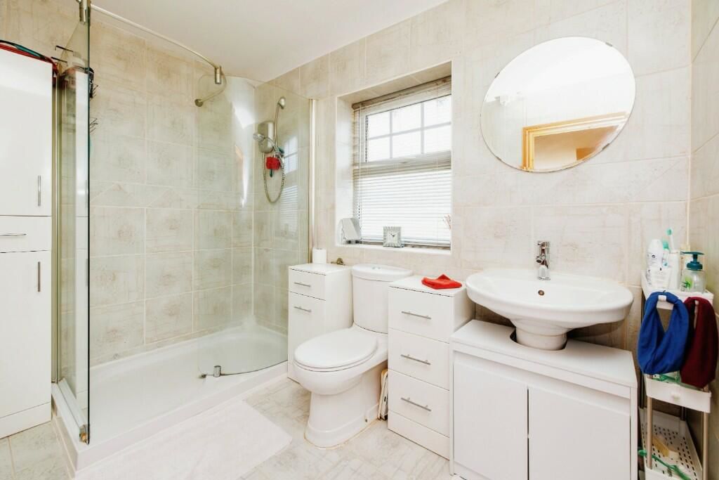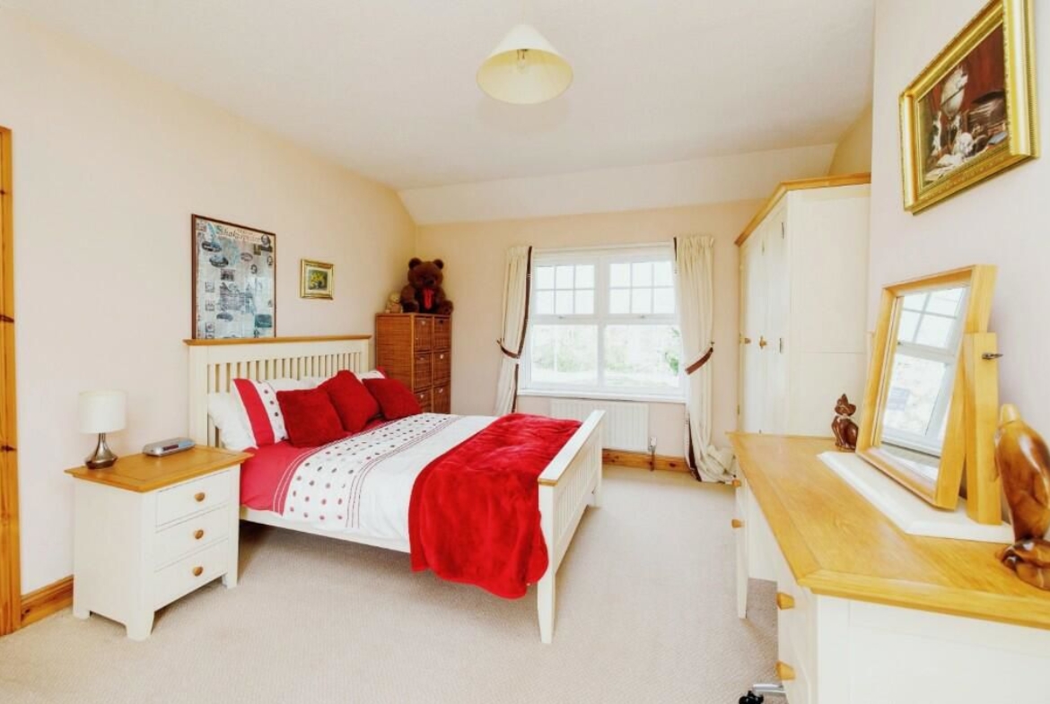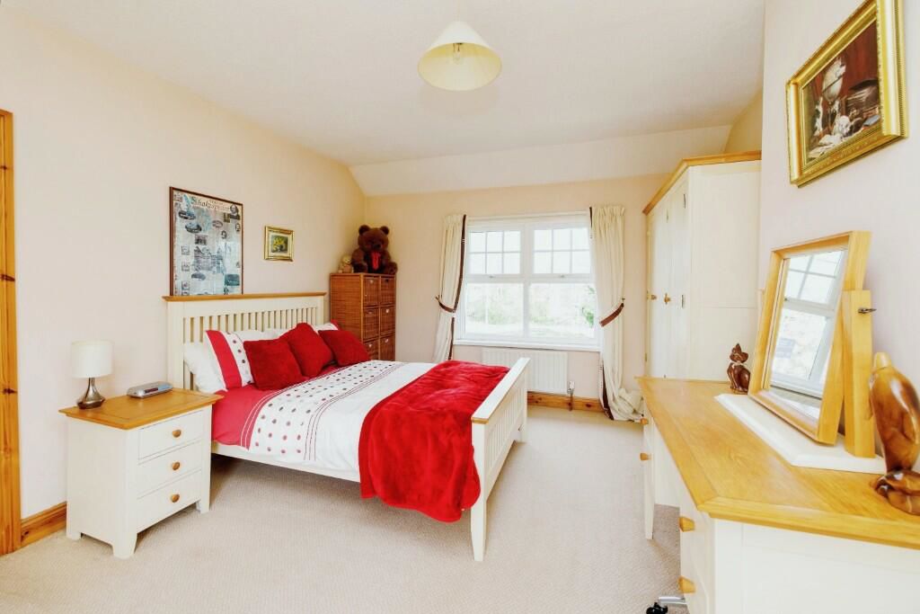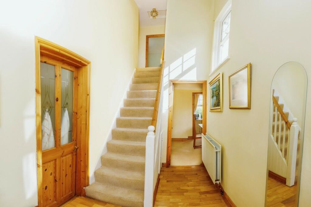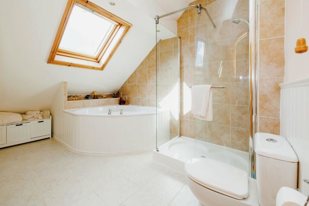 The spacious lounge which includes a York stone fireplace leads to the conservatory which overlooks the enclosed and private rear garden. There is an 18 foot garage with electric outlets and tap. To the rear of the 18′ garage is a large utility room which is plumbed for laundry appliances and includes storage units .The first floor offers three double bedrooms, with the master bedroom benefiting from a very generous en-suite. The family bathroom features a walk in shower, a corner bath, WC, wash basin, a heated towel rail and a large Velux window which floods the room with light and a vibrant view of the sky day and night.
