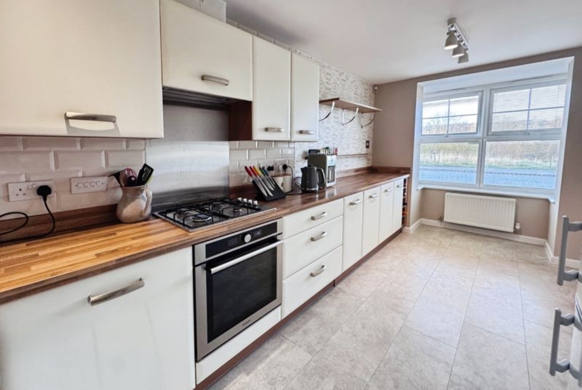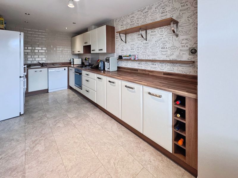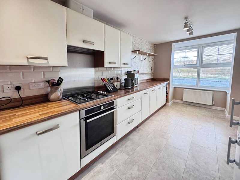 UPVC window to the front, fitted with a range of matching wall and base units with work surfaces above incorporating stainless steel sink unit with drainer, part tiled, integrated gas hob and electric oven, plumbed for washing machine, plumbed for dishwasher, breakfasting space and radiator.