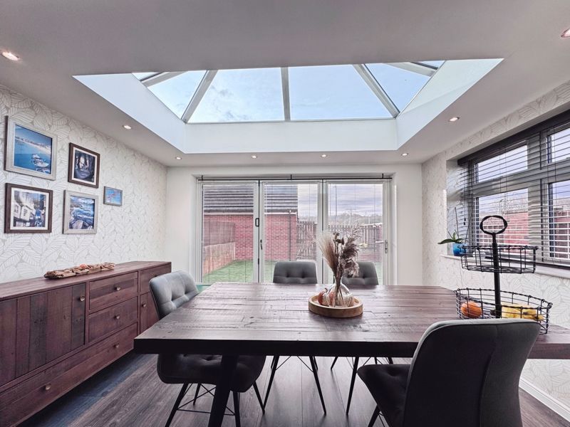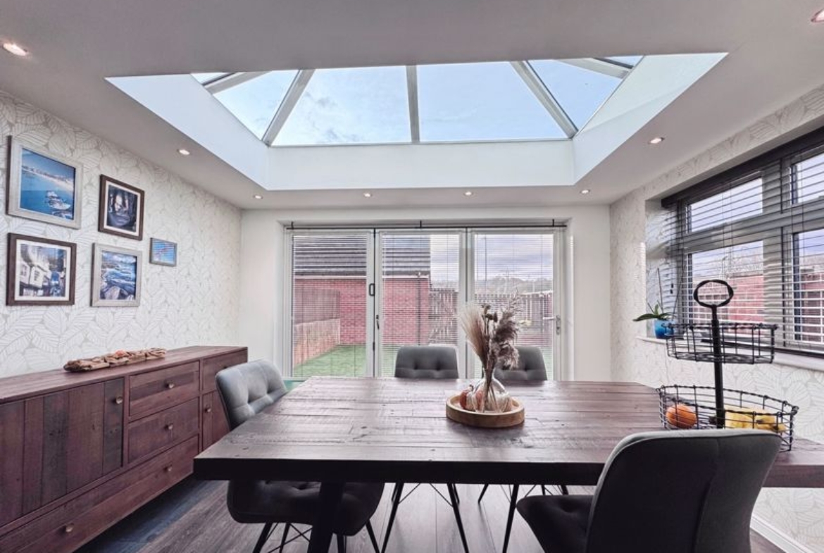 Extended. UPVC window, Bi-folding doors, ceiling lantern and radiator.