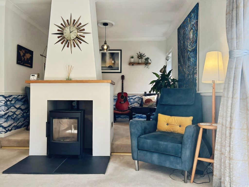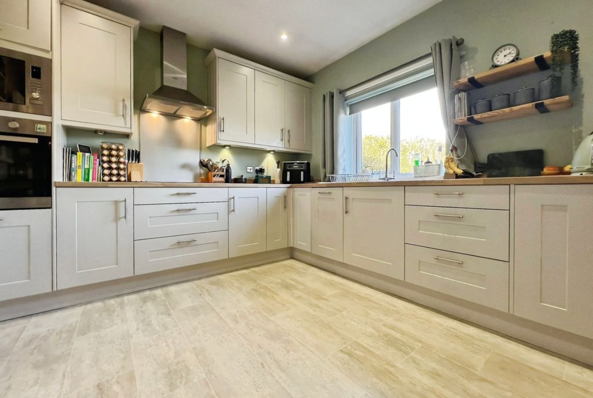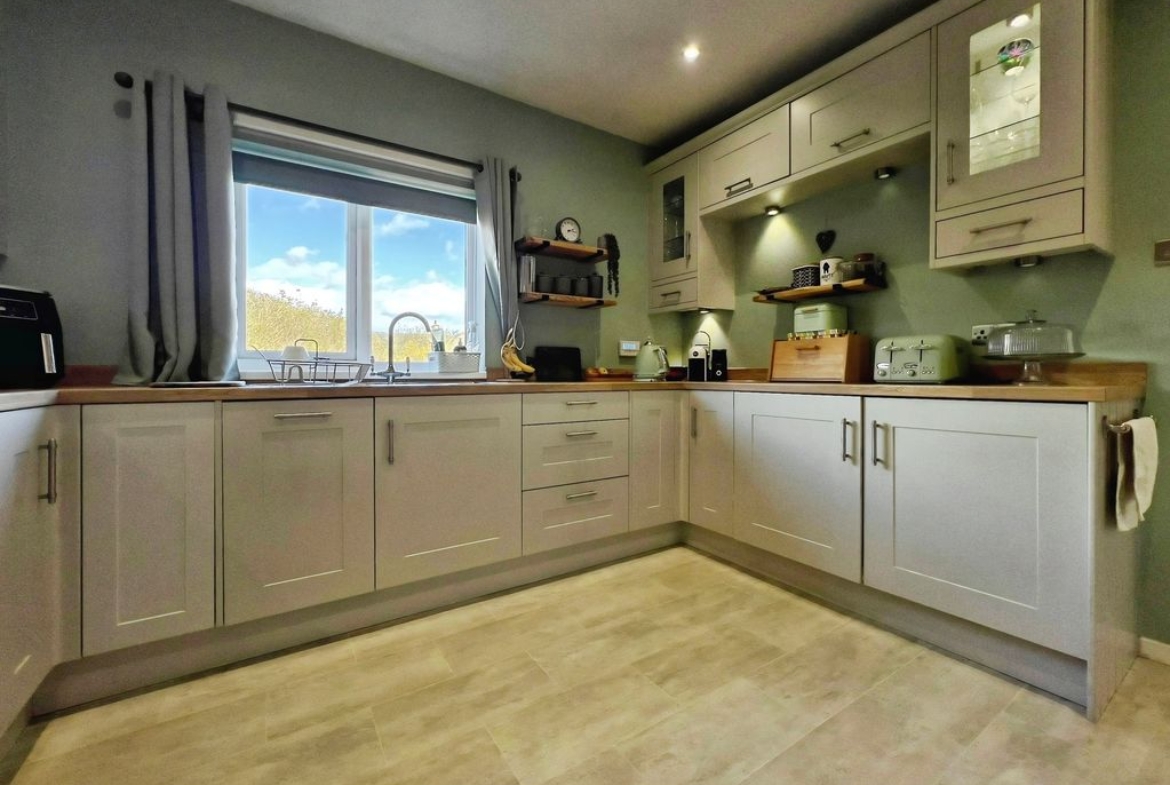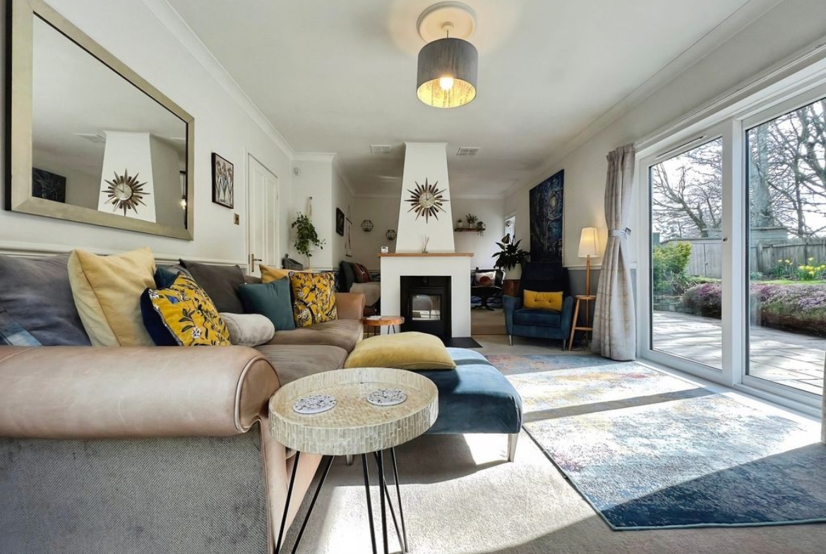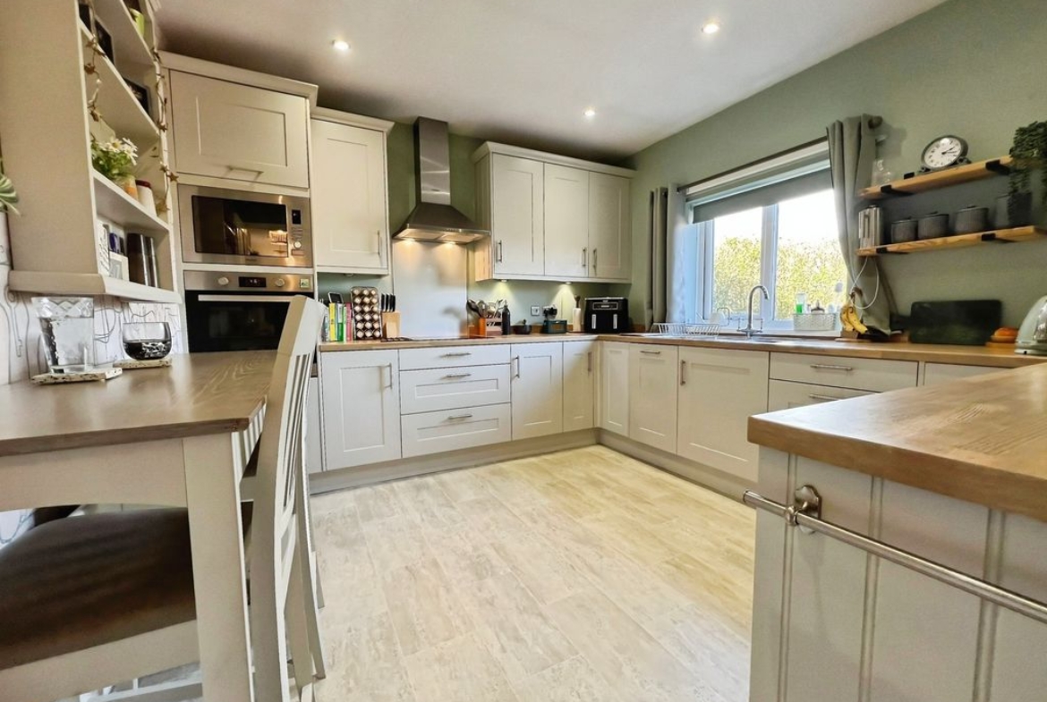 The property features open plan living with a reception space that includes a log burner set within a central fireplace, a raised dining area and direct access to the south-west facing garden. The garden enjoys open views and makes the most of afternoon and evening light. The kitchen benefits from natural light, dining space and shaker-style units, complementing the open-plan layout. There is also a separate utility room in the hallway.