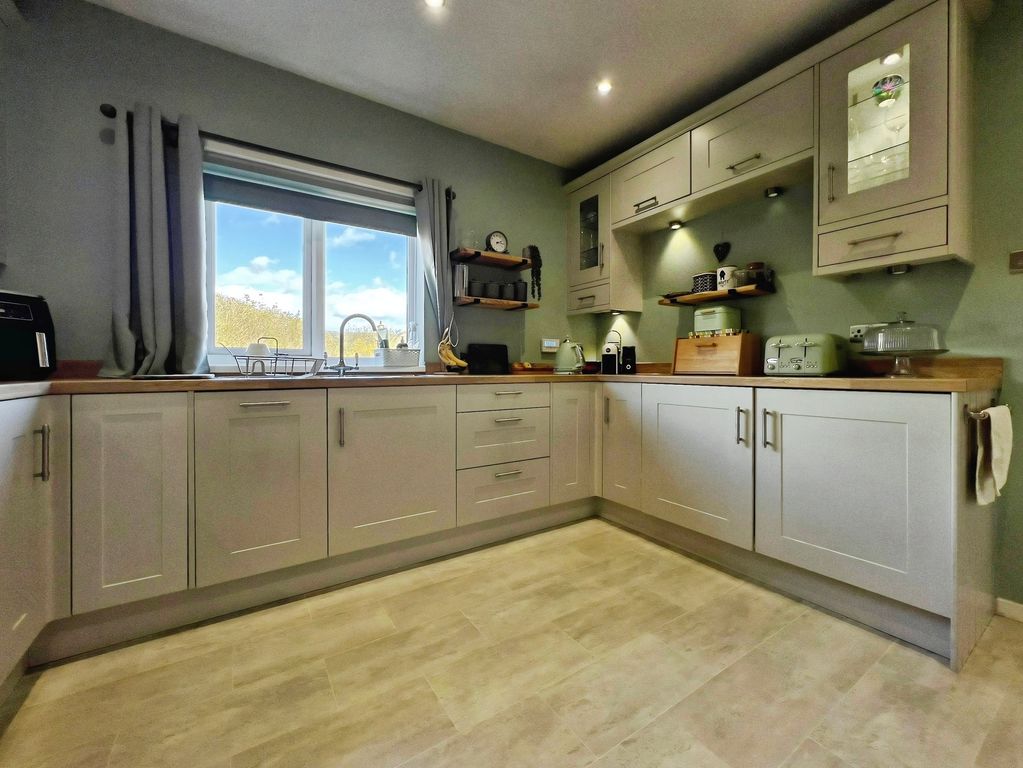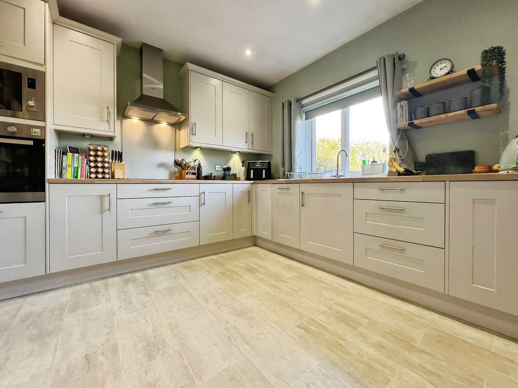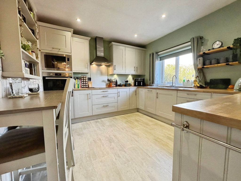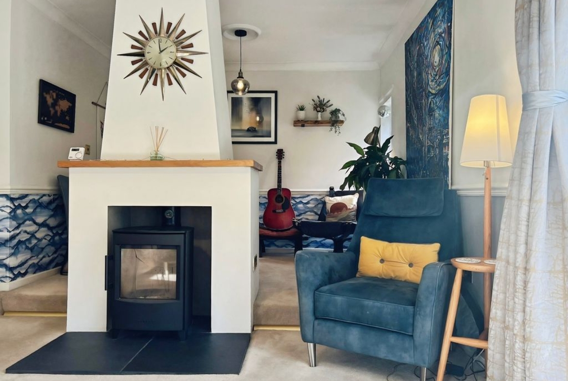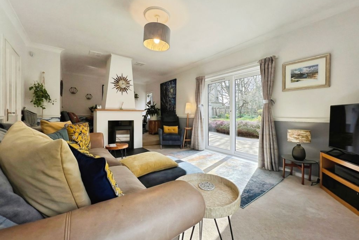 The property features open plan living with a reception space that includes a log burner set within a central fireplace, a raised dining area and direct access to the south-west facing garden. The garden enjoys open views and makes the most of afternoon and evening light. The kitchen benefits from natural light, dining space and shaker-style units, complementing the open-plan layout. There is also a separate utility room in the hallway.