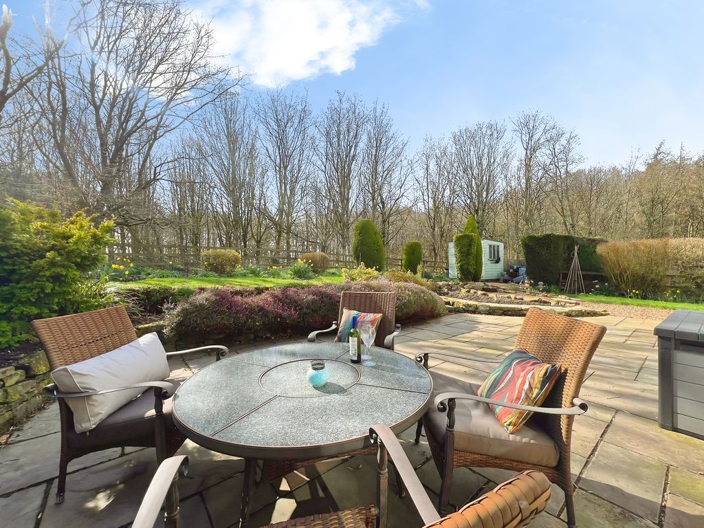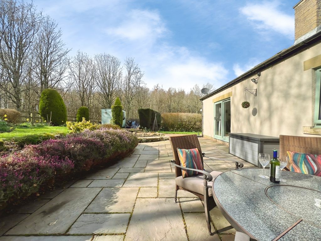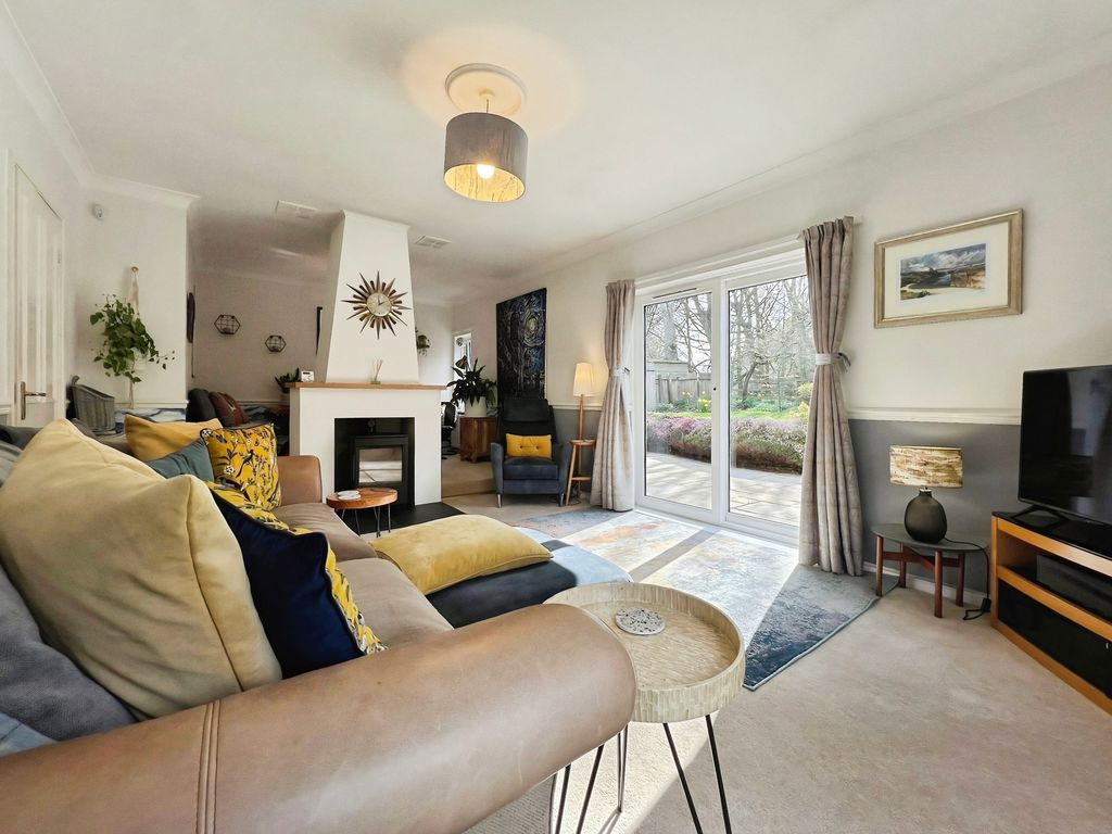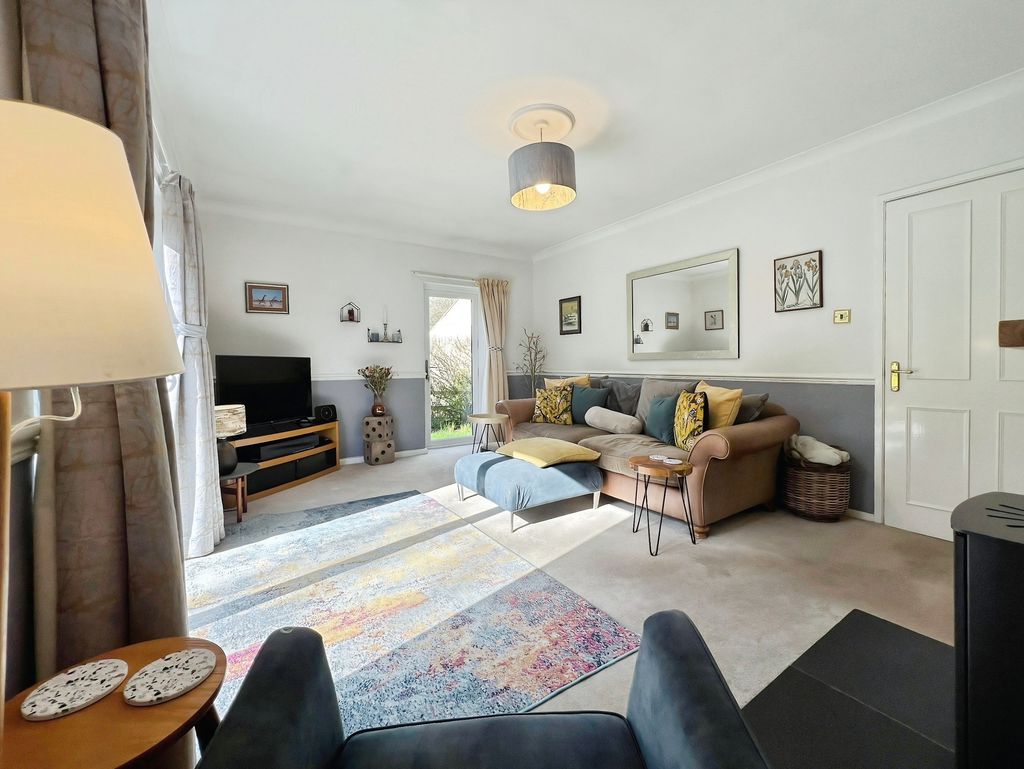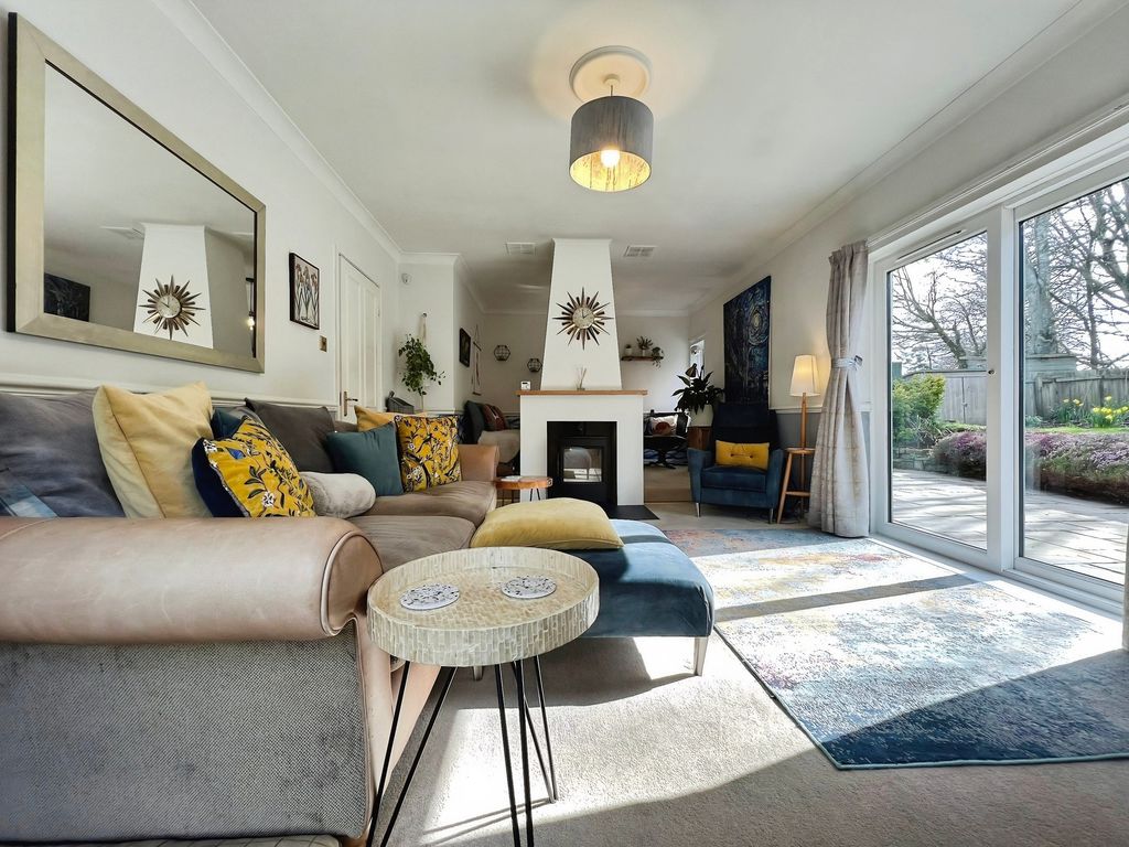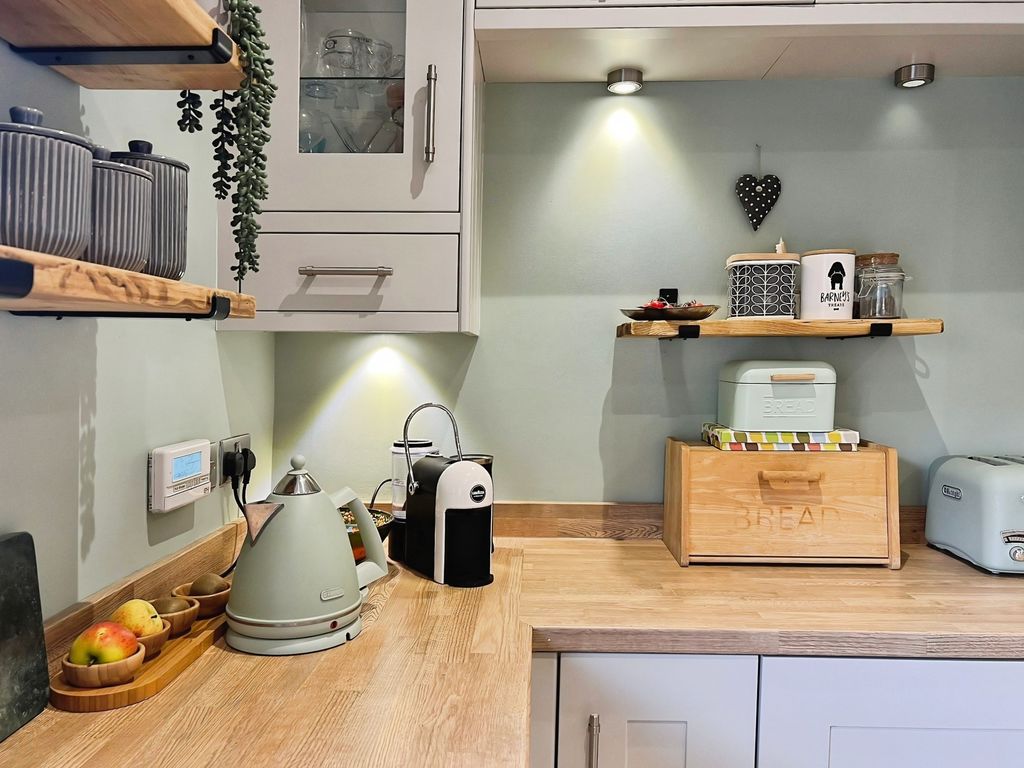 The property features open plan living with a reception space that includes a log burner set within a central fireplace, a raised dining area and direct access to the south-west facing garden. The garden enjoys open views and makes the most of afternoon and evening light. The kitchen benefits from natural light, dining space and shaker-style units, complementing the open-plan layout. There is also a separate utility room in the hallway.