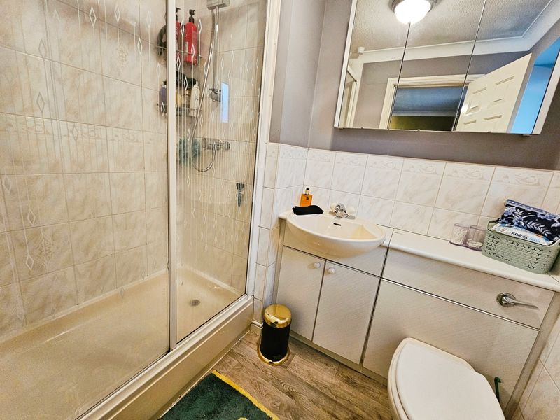 Double glazed window to rear, low level wc, wash hand basin (set in vanity unit), single radiator, extractor fan, shower cubicle (mains shower), part tiling to walls.