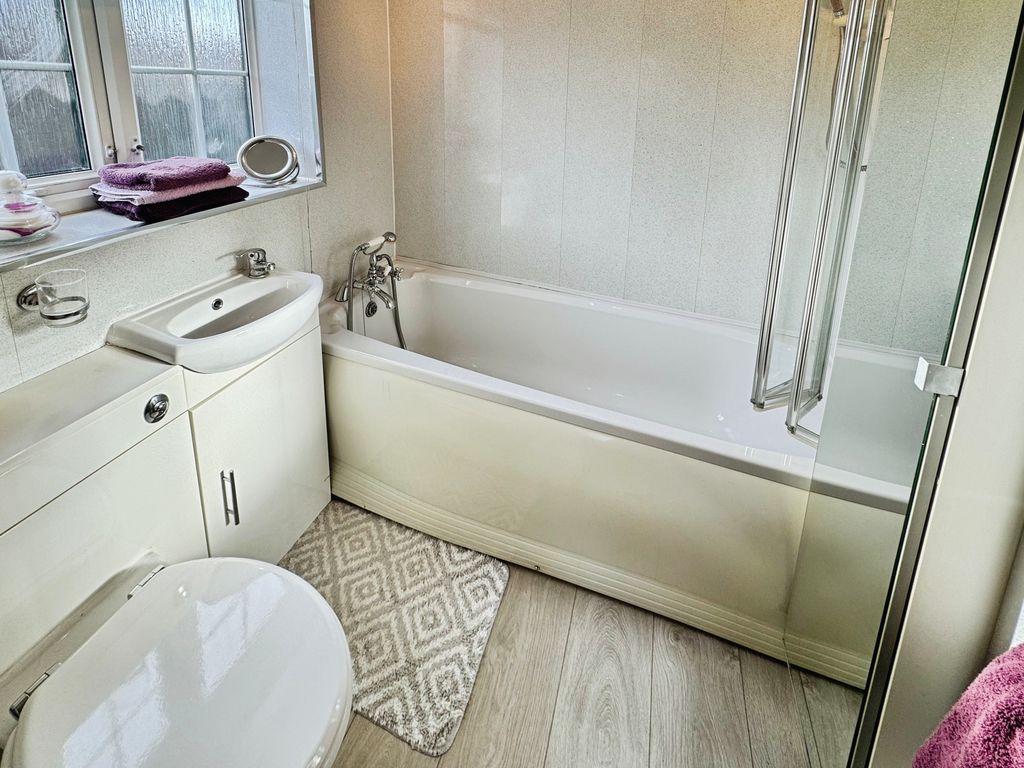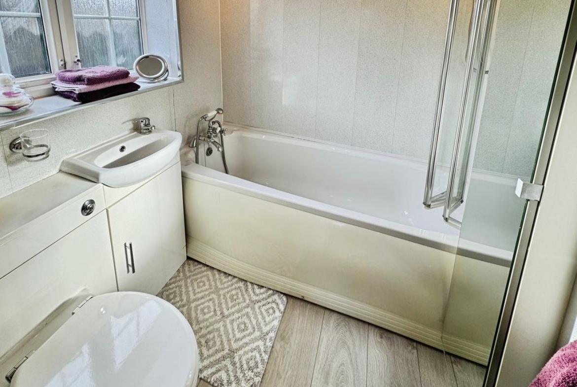UPVC window, bath with shower over, low level wc, vanity wash hand basin and fully cladded.