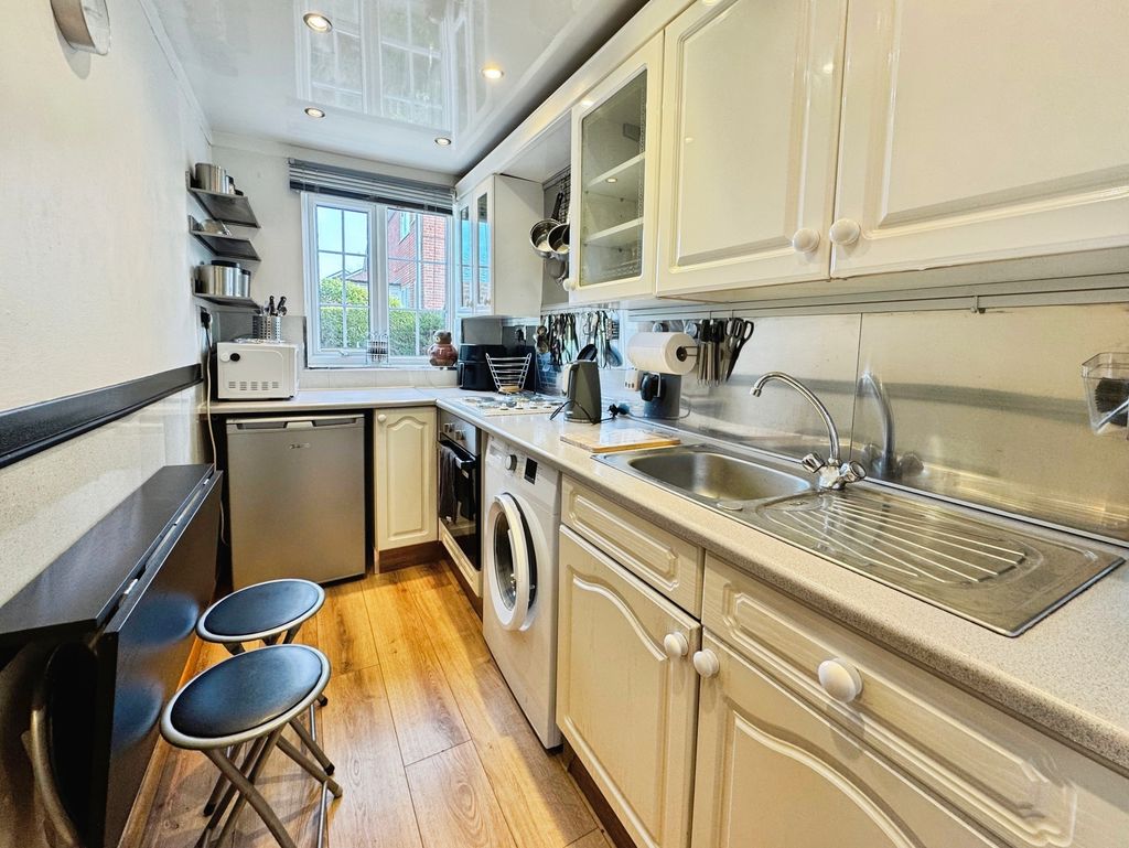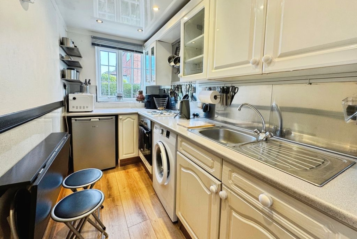 The reception room enjoys a garden view and includes built-in storage, making everyday living straightforward and organised. The kitchen benefits from natural light, creating a pleasant space for cooking. The double bedroom offers useful storage, while the bathroom features a shower over the bath.