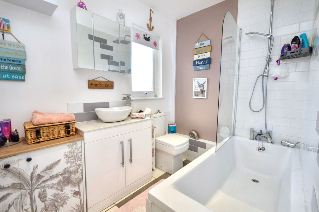 Bath with mains rainfall head shower and separate hand-held attachment – tiled surround and glass shower screen | Close coupled W.C. | Fitted cabinet incorporating a mono bowl sink | Tiled floor | Chrome ladder style radiator | UPVC double-glazed window | Ceiling downlights | Extractor fan