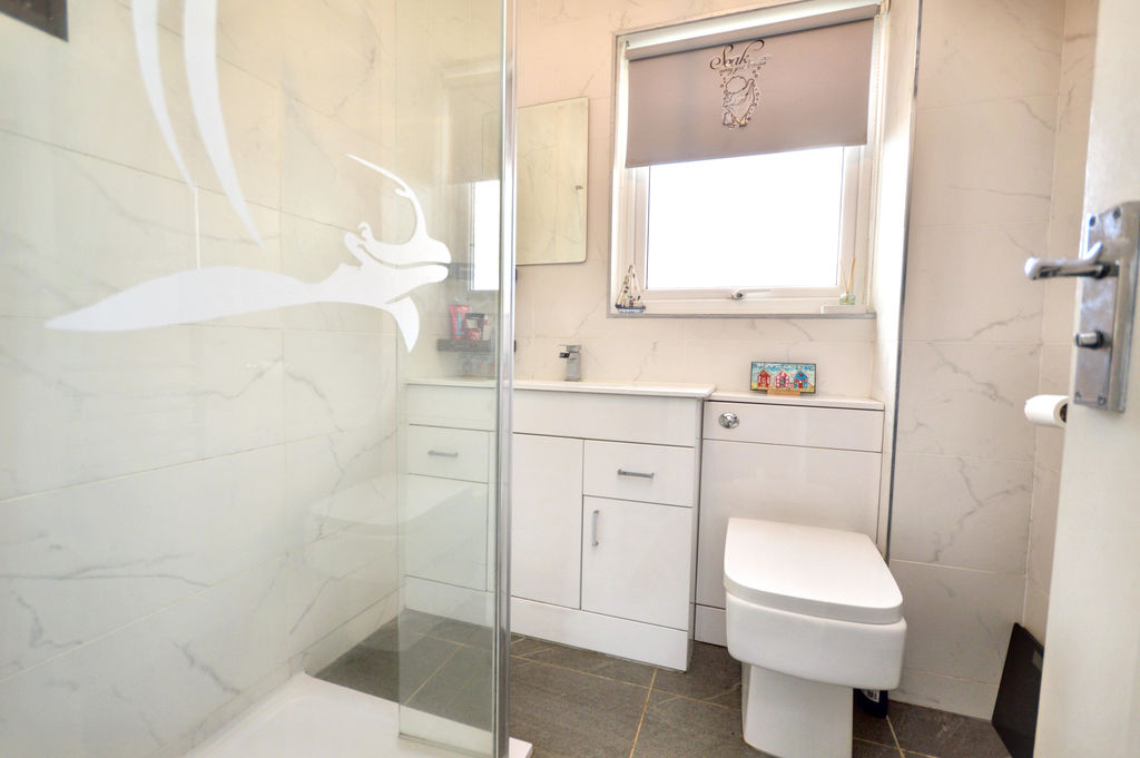 Walk-in shower with glass screen incorporating a mains rainfall head shower and separate hand-held attachment | Fitted cabinets incorporating a wash-hand basin and W.C. | Chrome ladder style electric radiator | Fully tiled walls and floor | UPVC double-glazed frosted window