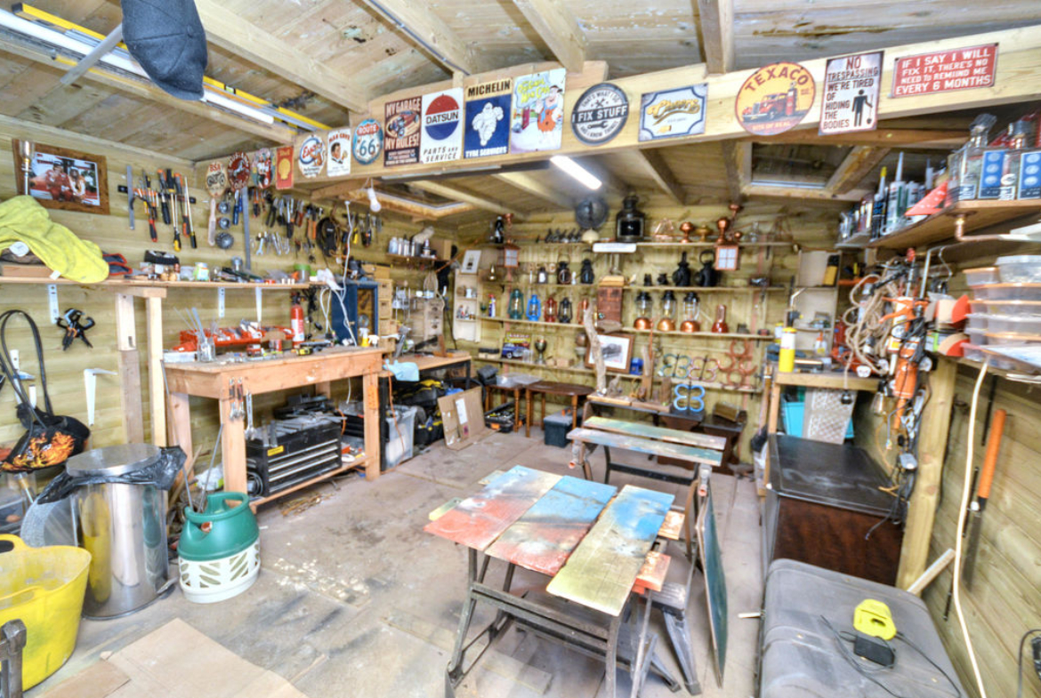 Externally, the property continues to impress. A substantial cabin sits to the side of the house, fully equipped with power and electricity. Originally purchased as a garage, it is currently utilised as a workshop, offering fantastic versatility for a variety of uses.