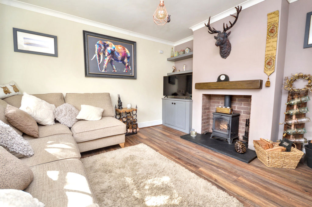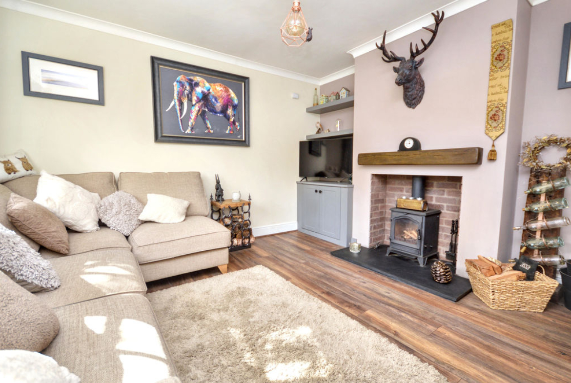 UPVC double-glazed bay window | Antique style radiator | Laminate floor | Inglenook fireplace with a slate hearth incorporating a multi-fuel stove | Fitted cupboard and shelves | Coving to ceiling