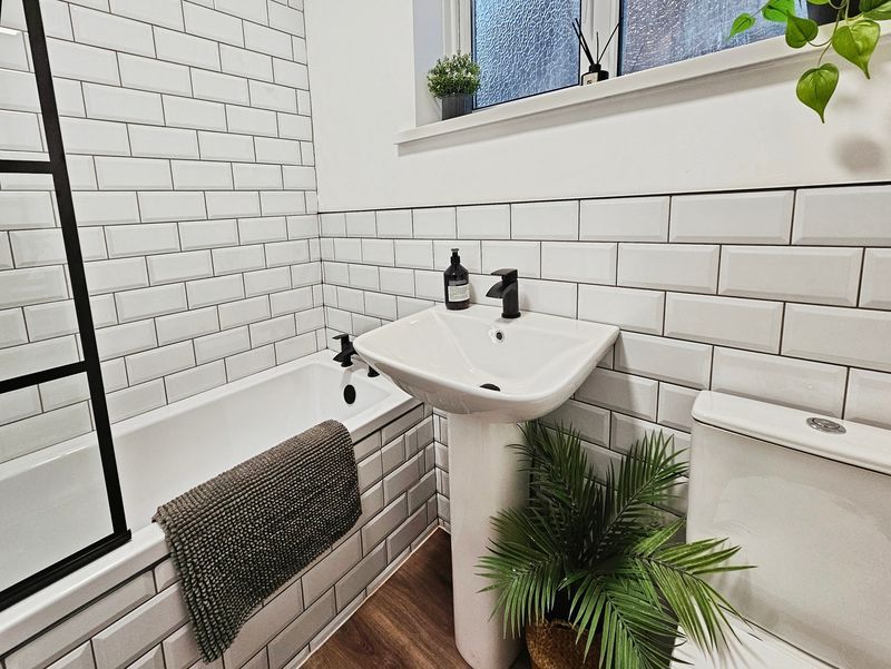 Three piece white suite comprising of; panelled bath with mains shower over, pedestal wash hand basin, low level wc, double glazed window to side, heated towel rail, part tiling to walls, LTV flooring, loft access, storage cupboard.