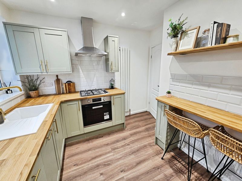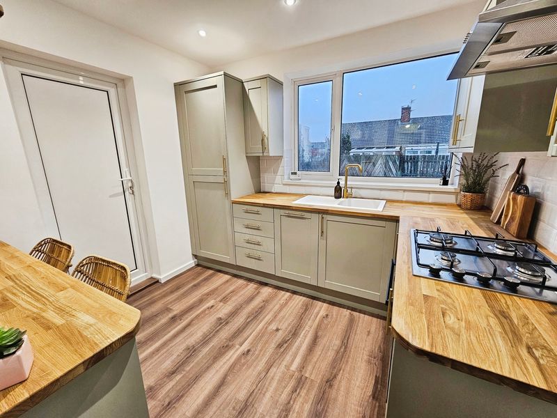 Double glazed window to rear, wall mounted radiator, fitted with a range of wall, floor and drawer units with co-ordinating roll edge work surfaces, co-ordinating sunk unit and drainer with mixer tap, breakfast bar, tiled splash backs, built in electric fan assisted oven, gas hob with extractor fan above, integrated fridge freezer and dishwasher, LVT flooring, spotlights, door to garage.