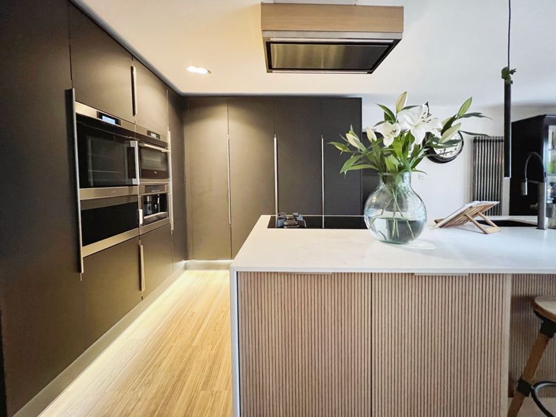 The reception room is a spacious, light-filled space, adorned with large windows and a fireplace. It opens out onto a south-facing patio and garden through crittall doors, offering an extended living space during warmer months. The garden also accommodates a useful garden office, perfect for those who work from home. The kitchen is a modern dream, boasting an open-plan design with a kitchen island and built-in pantries and appliances. The marble countertops glisten under the natural light flowing in. The kitchen also includes a breakfast area and a separate utility room, providing convenience and functionality.