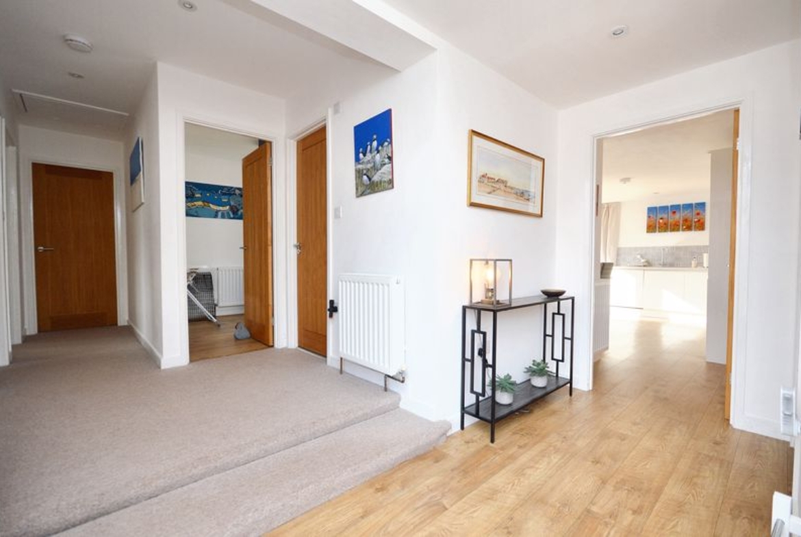 Double-glazed frosted windows and entrance door | Laminate floor | Radiator | Storage cupboard | Loft access hatch | Door to bedrooms, living room, utility, bathroom, and kitchen.