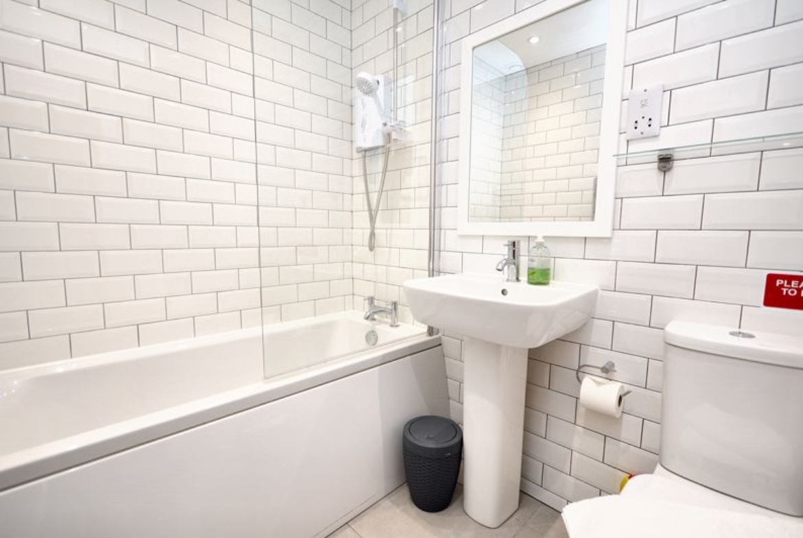 Bath with electric shower over and glass screen | Pedestal wash-hand basin | Close-coupled W.C | Chrome ladder -tyle radiator | Shaver point | Extractor | Fully tiled walls | Tiled floor | Downlights