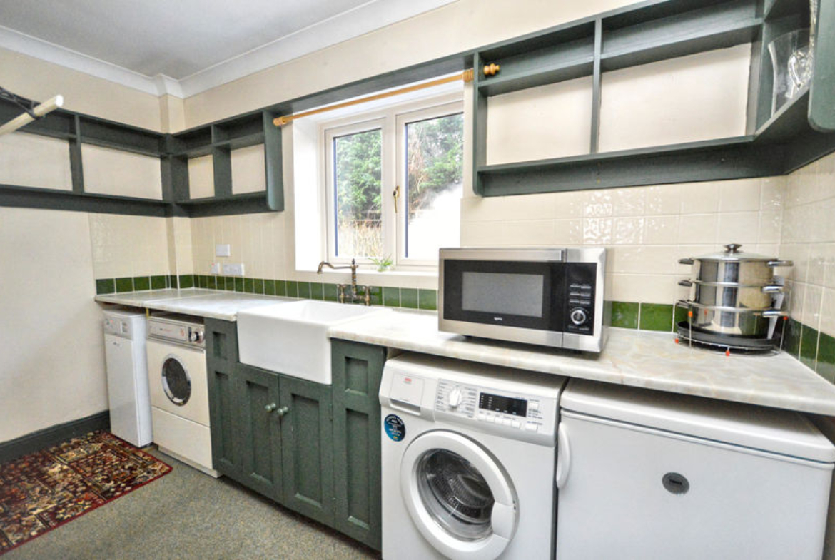 UPVC double-glazed window | Part-tiled walls | Fitted sink unit incorporating; a Belfast sink and workbench, space for; washing machine, tumble dryer, under counter fridge | Freestanding central heating Worcester oil boiler | Radiator | Fitted shelves | Laundry dryer with pulley | Coving to ceiling