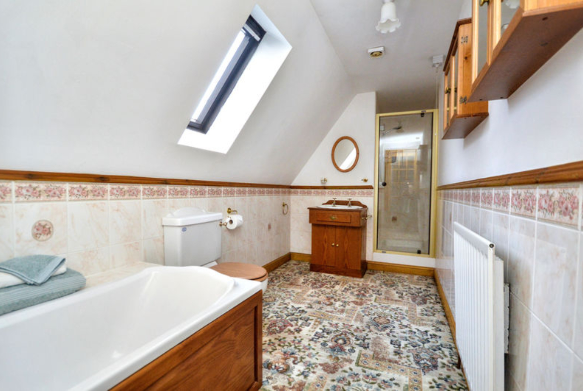 Panelled bath | Cabinet with integrated hand-hand basin| Close-coupled W.C | Tiled shower cubicle incorporating an electric shower | Part-tiled walls | Dado rail | Radiator | Shaver point | Extractor fan | Double-glazed Velux window