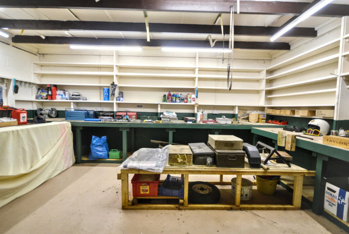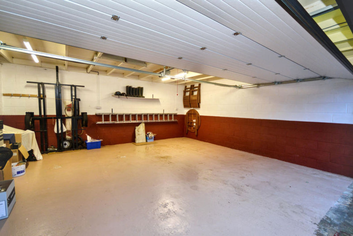 Electric up-and-over garage door | Access to overhead loft space for storage | Electric power sockets | Lighting | Open to workshop area and concealed door to second workshop