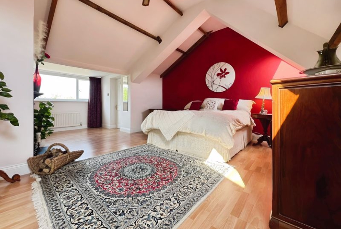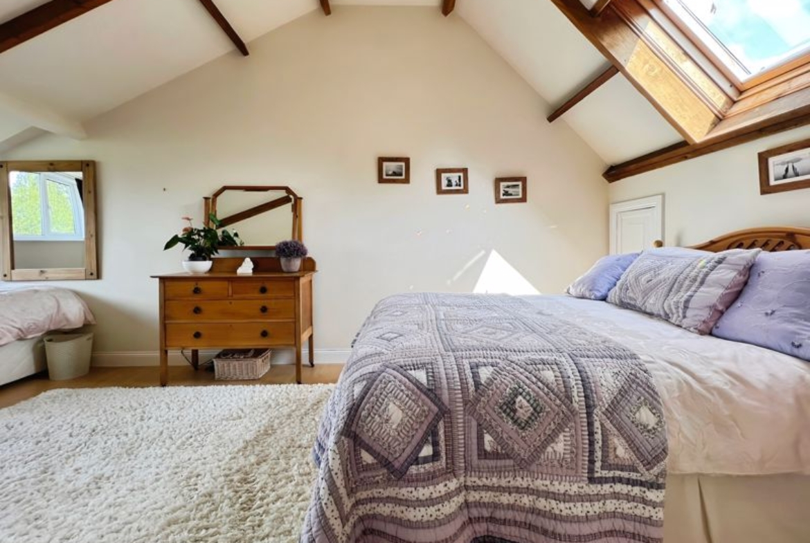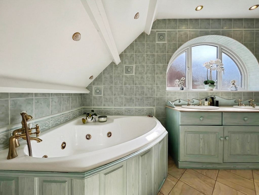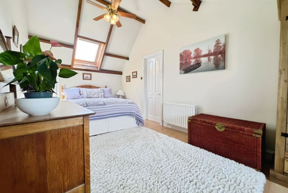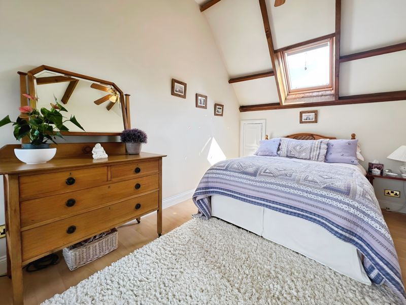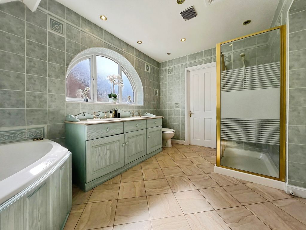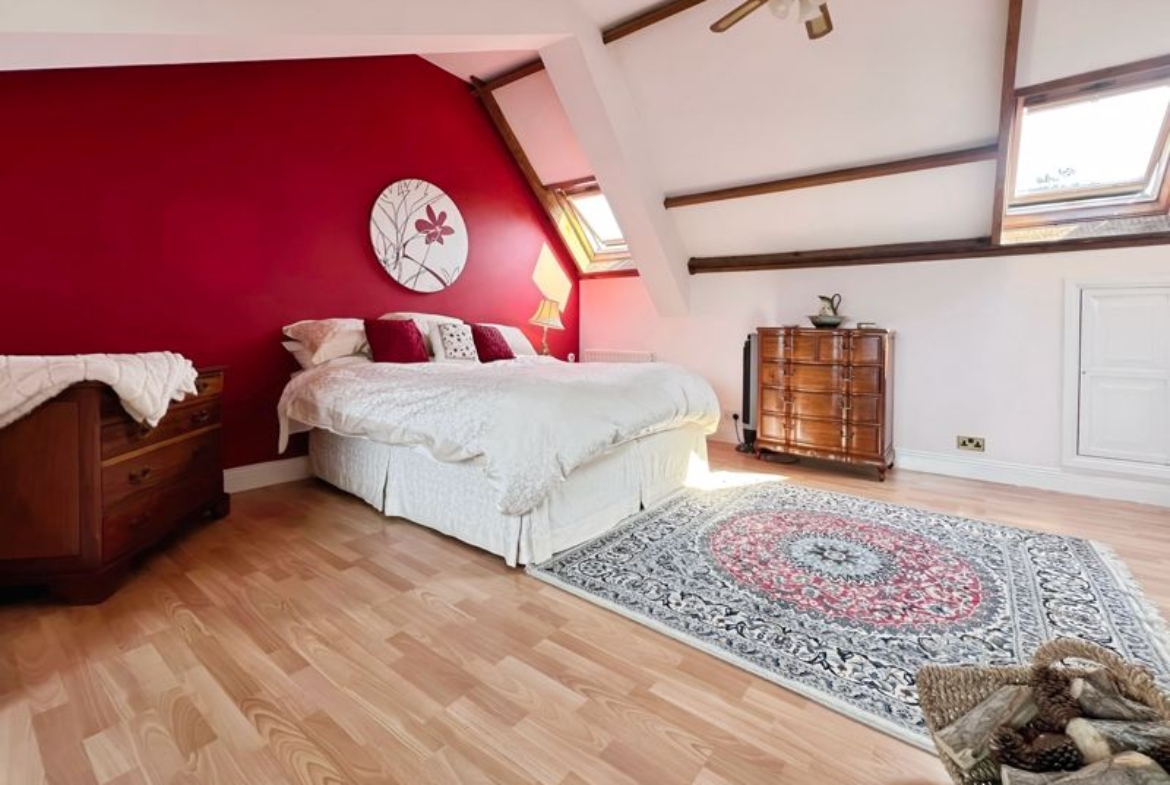The open-plan kitchen is filled with natural light and offers generous dining space, utility room facilities, and access to the garden—perfect for both everyday living and entertaining. Four generously sized bedrooms are included, with the master benefitting from vaulted ceilings, an en-suite bathroom with a corner jacuzzi bathtub, a walk-in closet, and a spacious layout. A second bedroom also offers vaulted ceilings, an en-suite, and accommodates a double bed. Bedrooms three and four are both well-proportioned doubles.