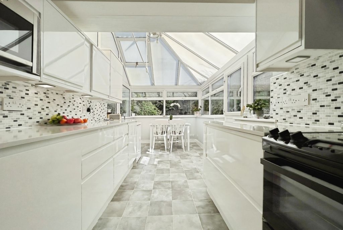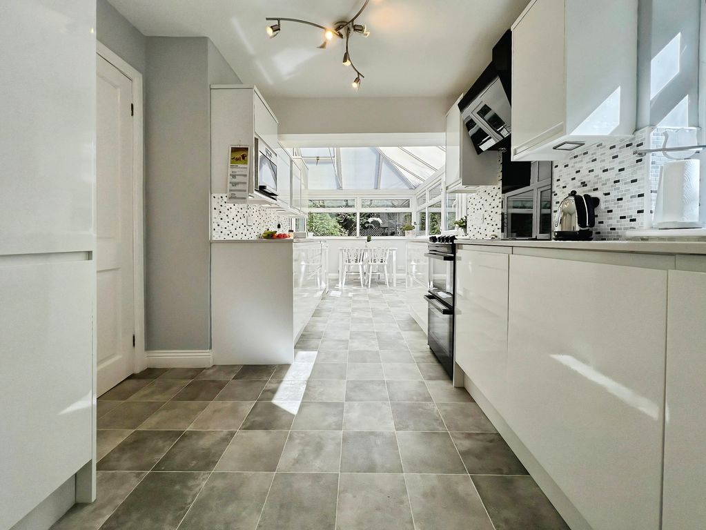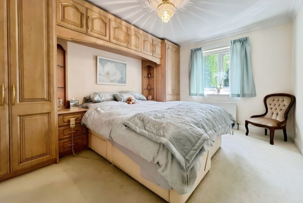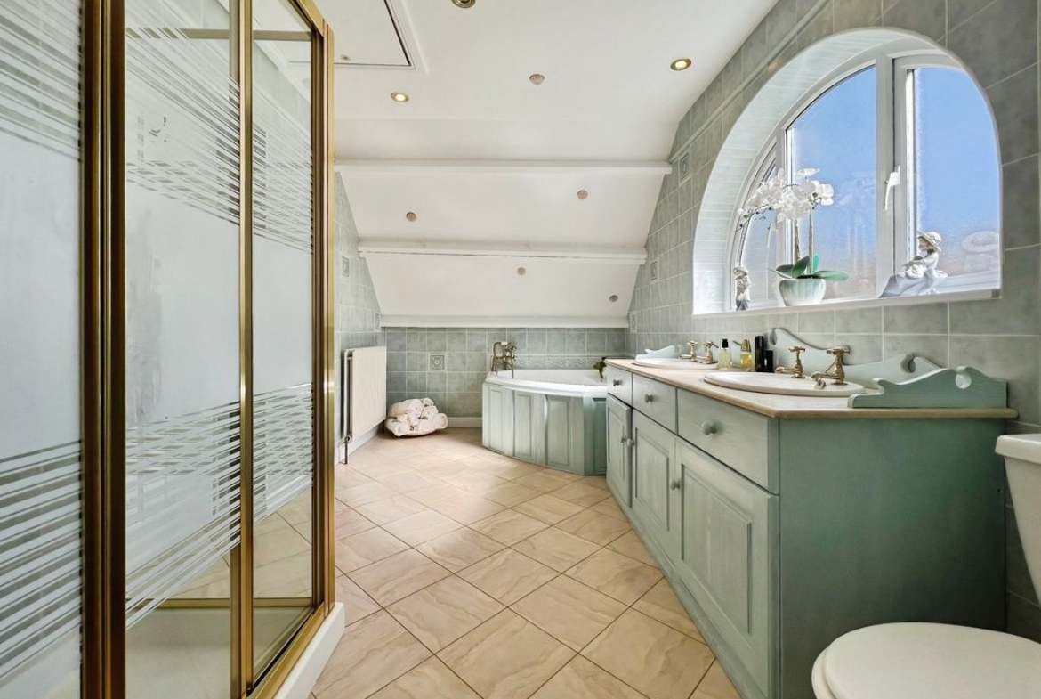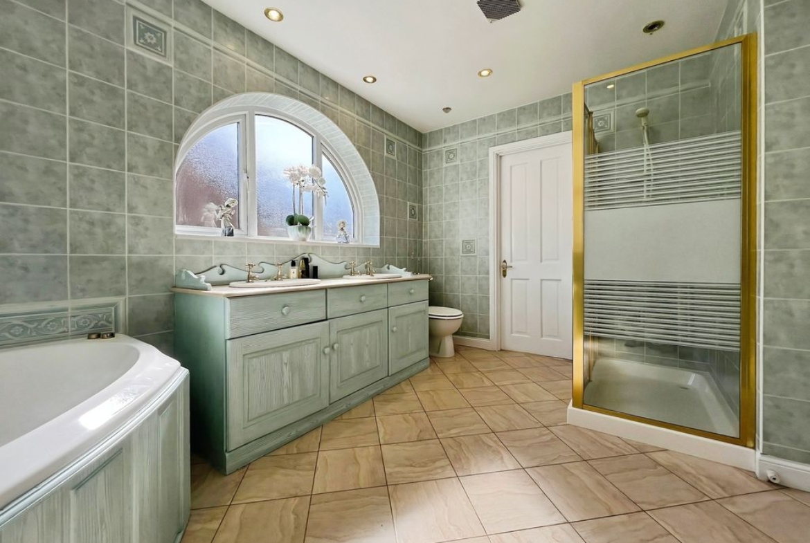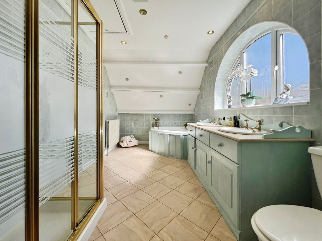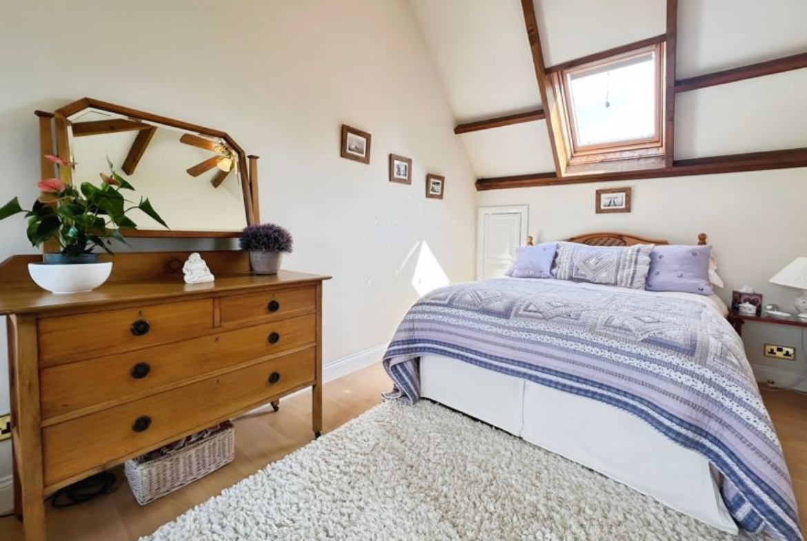 The open-plan kitchen is filled with natural light and offers generous dining space, utility room facilities, and access to the garden—perfect for both everyday living and entertaining. Four generously sized bedrooms are included, with the master benefitting from vaulted ceilings, an en-suite bathroom with a corner jacuzzi bathtub, a walk-in closet, and a spacious layout. A second bedroom also offers vaulted ceilings, an en-suite, and accommodates a double bed. Bedrooms three and four are both well-proportioned doubles.