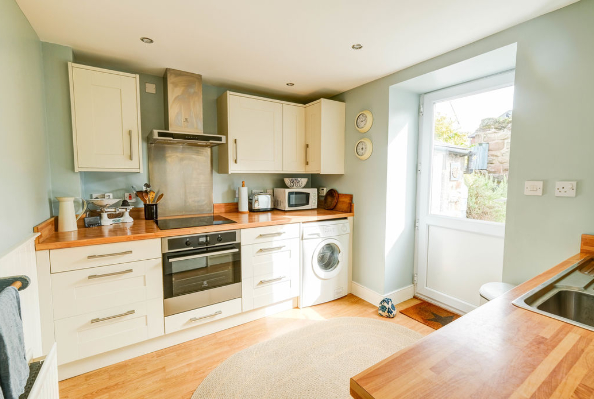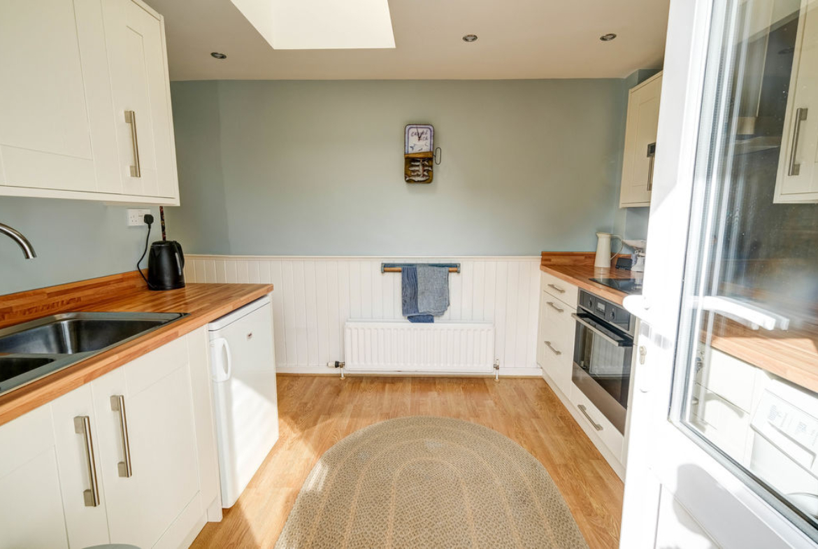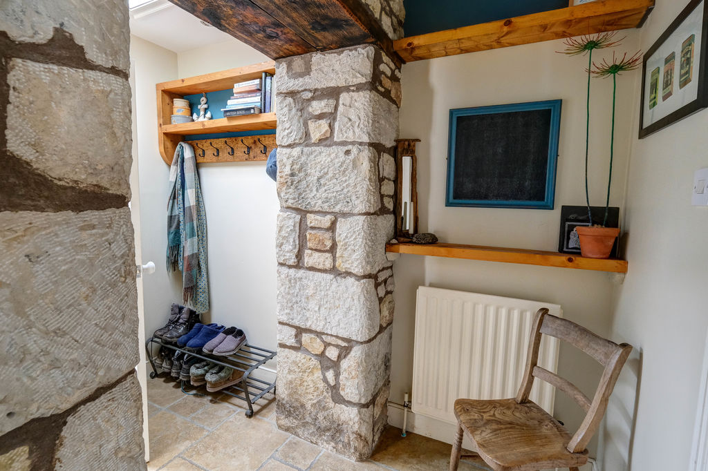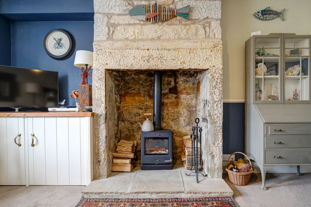 On entering, the lobby accesses the stairs to the first floor and walking into the lounge an original fireplace recess with stone upstands and lintel frames the wood burning stove. The window to the front fills the room with natural light and there is ample space for everyday living with a small table for eating. The inner lobby with exposed stone walls is the perfect space for coats and shoes and there is a useful storage cupboard under the stairs.