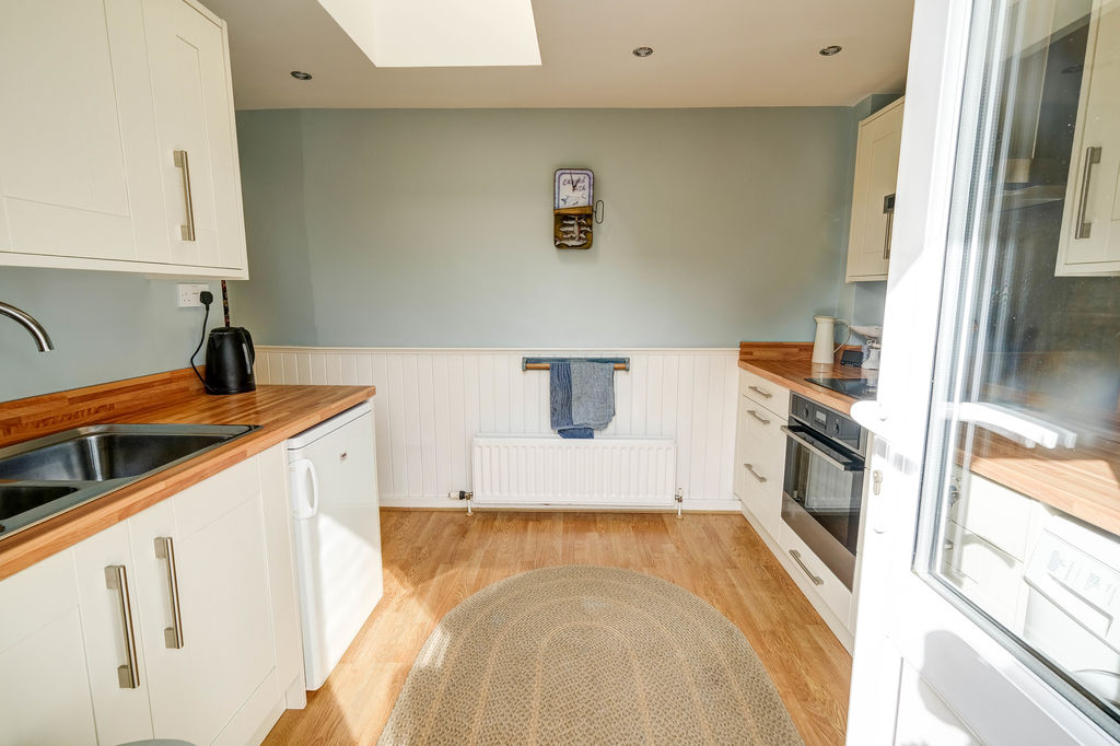The kitchen is well equipped with wall and base units, work surfaces and a sink unit along with a built-in electric hob, oven and extractor and space for a washer and fridge. This light and airy room is enhanced with a Velux rooflight and glazed rear door to the courtyard. There is a shower room located to the ground floor with walk in shower, vanity wash hand basin and low level w.c.