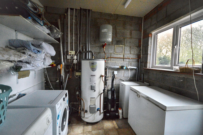 UPVC double-glazed window & door to rear garden | Central heating boiler | Hot water cylinder | Plumbing for washing machine | Electric power sockets & lighting | Fitted shelves