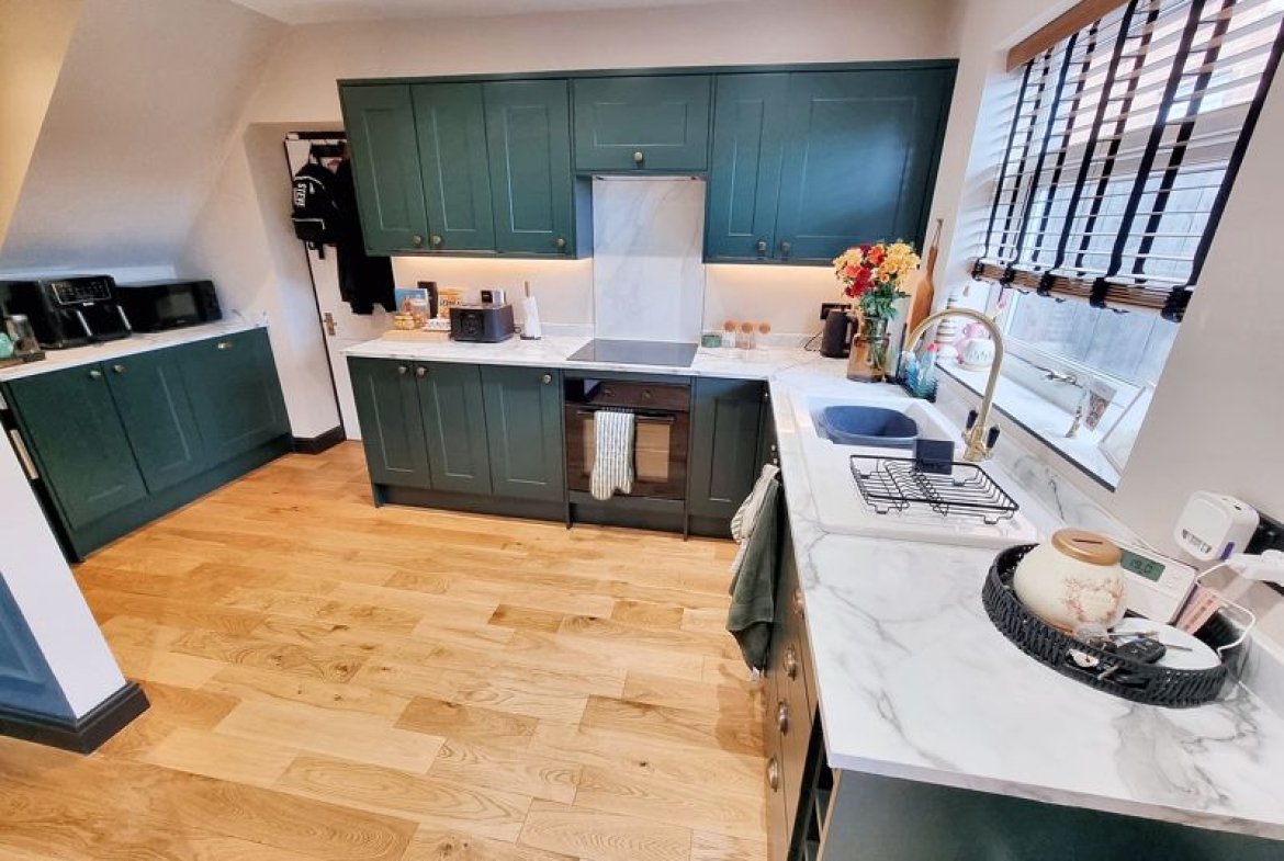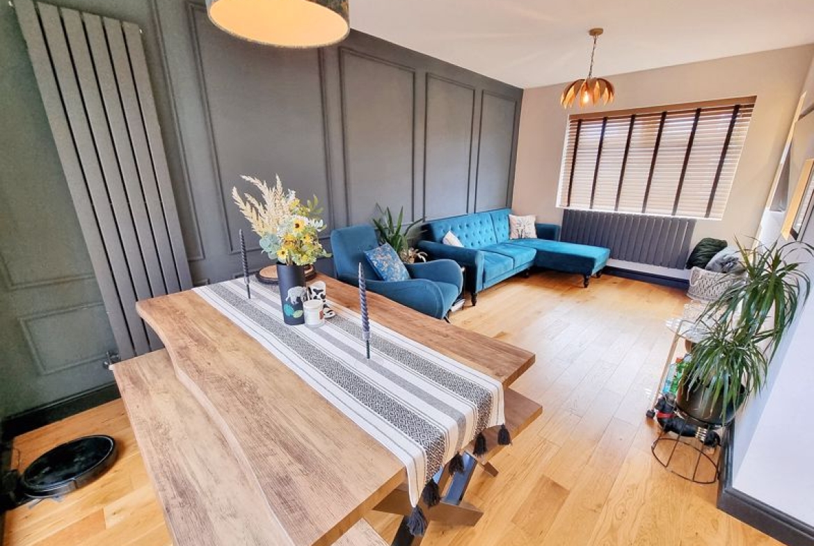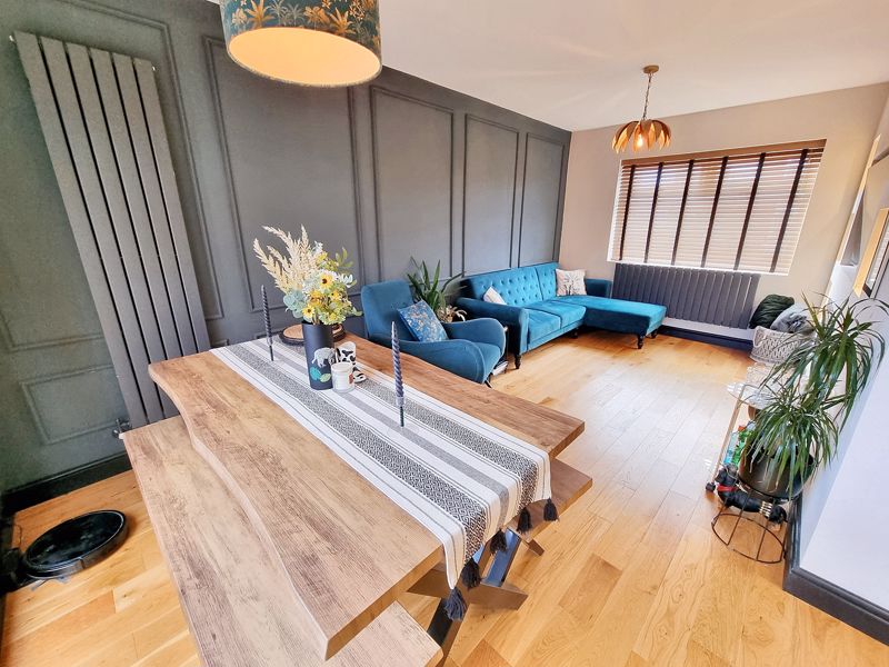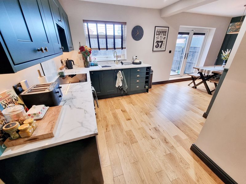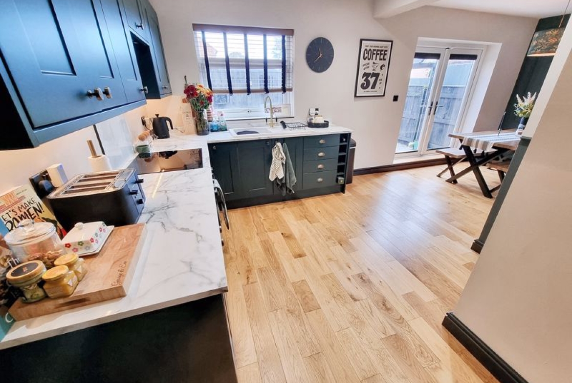 The property boasts a welcoming reception room, featuring attractive wood floors. The open-plan kitchen is designed to maximise space and function, making it ideal for family meals or social gatherings.