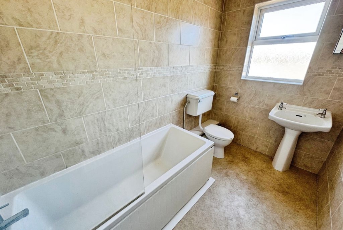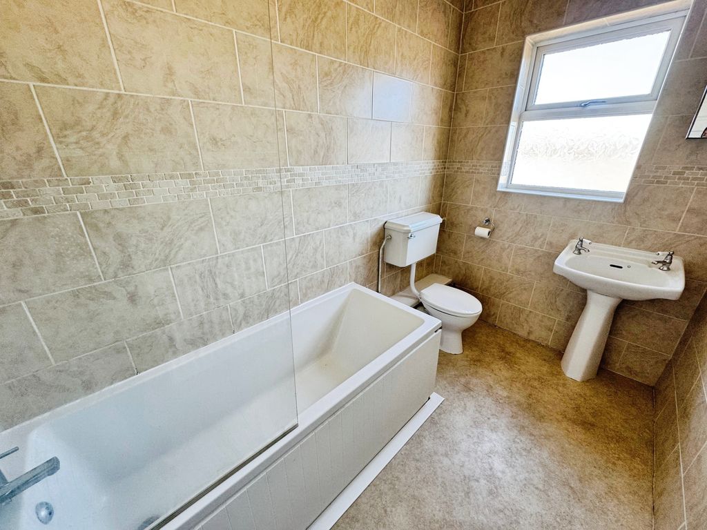 UPVC window, bath with shower, low level wc, wash hand basin, fully tiled and radiator.