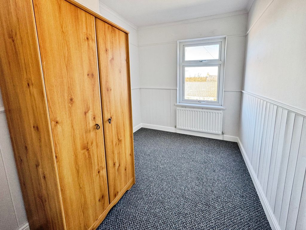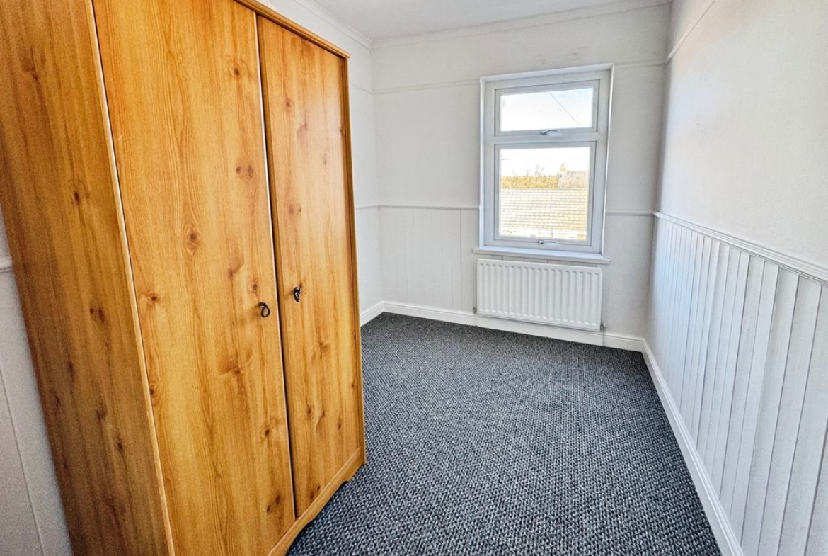 Upstairs, the main bedroom is a double with built-in storage, and there is a further single bedroom. The bathroom is fitted with a suite including a shower over the bath.