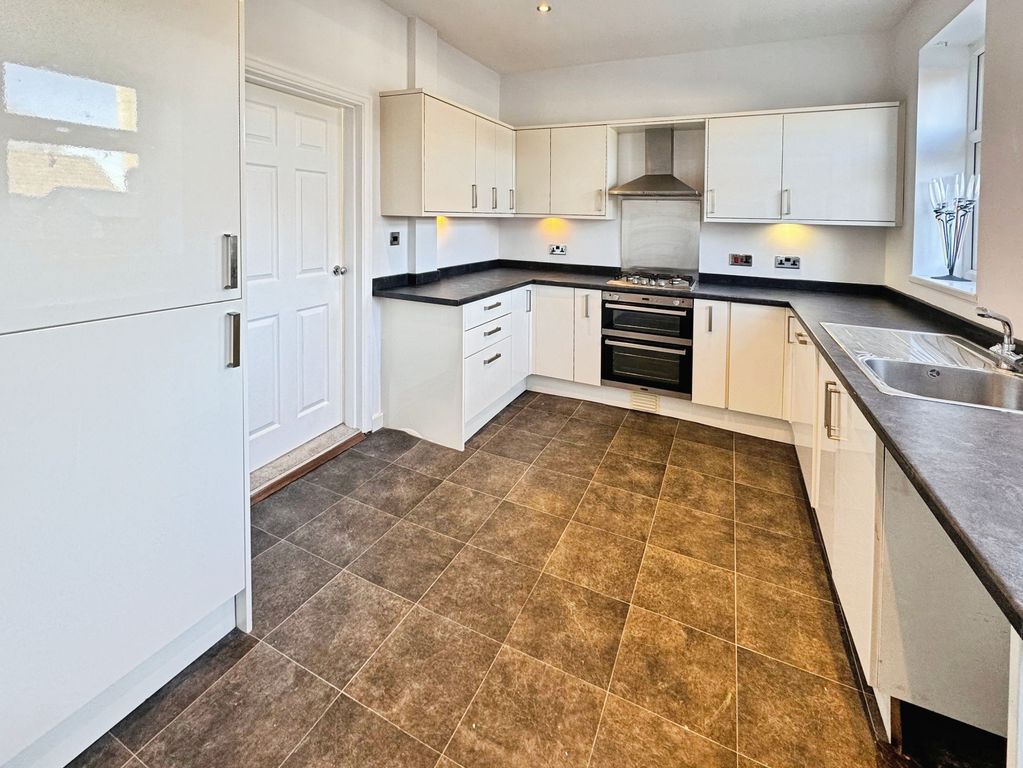 UPVC window, UPVC door, fitted with a range of matching wall and base units with work surfaces above incorporating sink with drainer, integrated gas hob, electric oven and grill, dishwasher, fridge freezer, plumbed for washing machine and radiator.