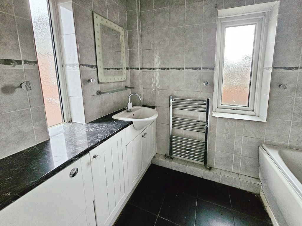 Three piece white suite comprising of panelled bath with mains shower over, wash hand basin, low level wc, double glazed window to rear and side, heated towel rail, tiling to walls and flooring, cladding to ceiling.