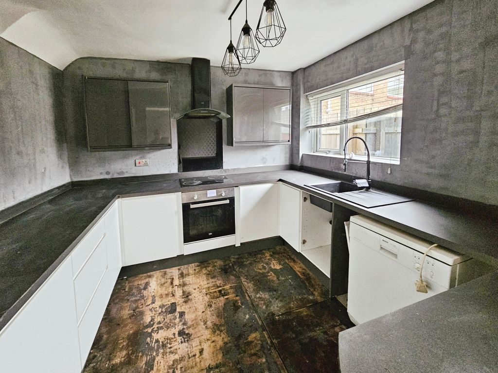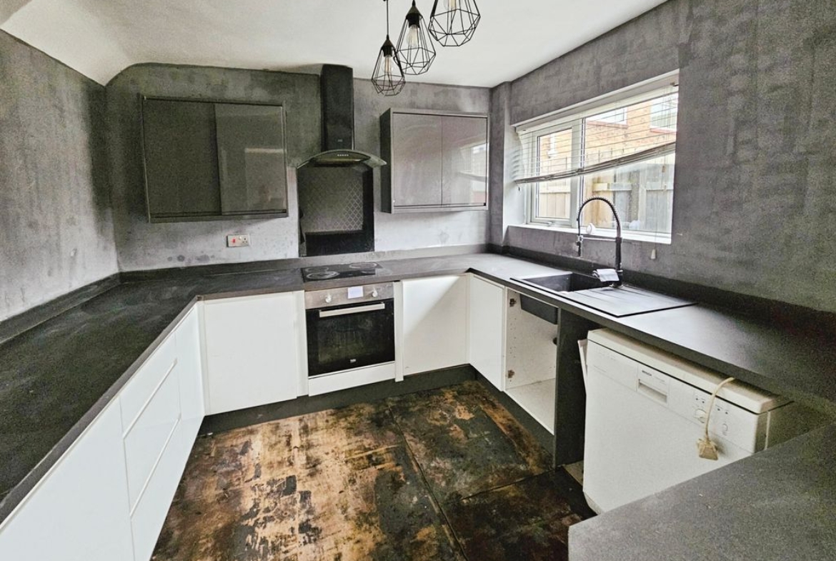 Double glazed window to rear, fitted with a range of wall, floor and drawer’s units with co-ordinating roll edge work surfaces, co-ordinating sink unit and drainer with mixer tap, built in electric fan assisted oven,  electric hob with extractor fan above, space for fridge freezer, plumbed for washing machine and dishwasher.
