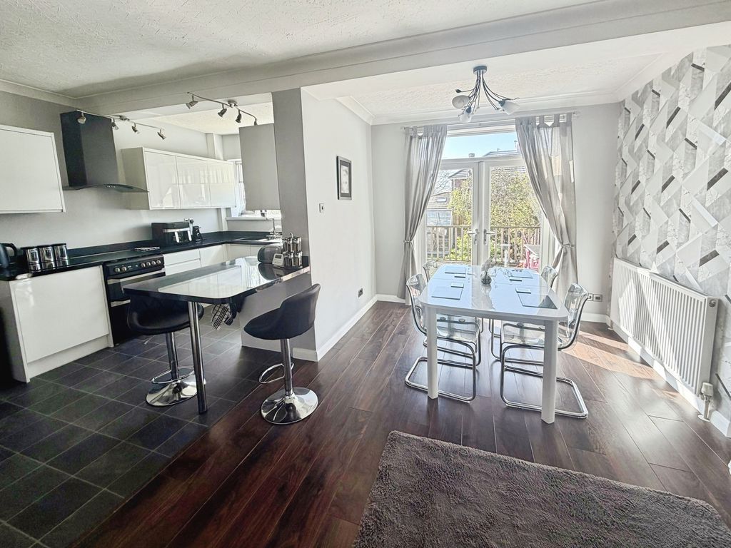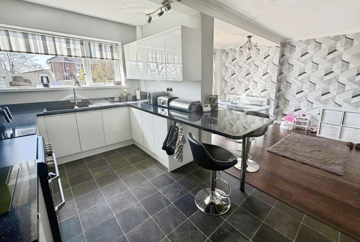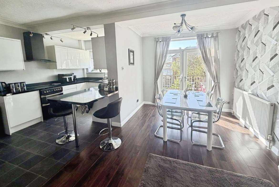The property features an open-plan lounge flowing seamlessly into a contemporary kitchen/diner, creating an ideal space for both relaxing and entertaining. A separate utility room adds further practicality.